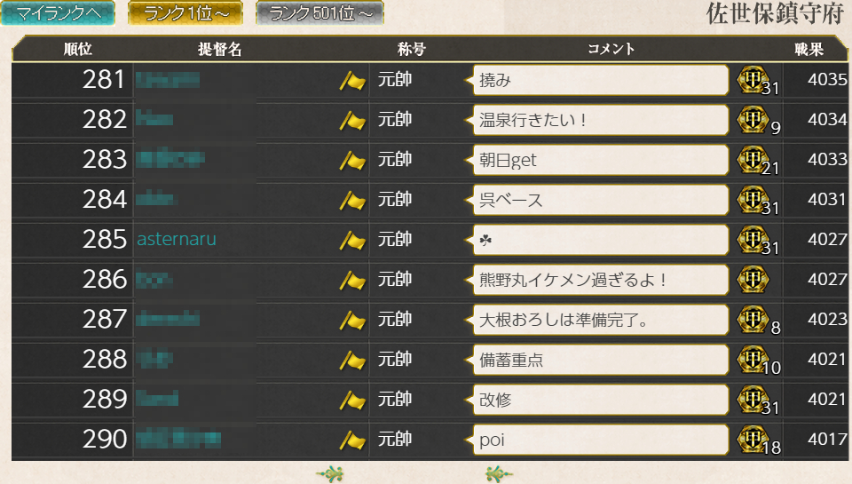 肝心の戦果は最終更新で285位と大分余裕があったので問題ないでしょう。[#1-6]の特別戦果もここに加算されますし。