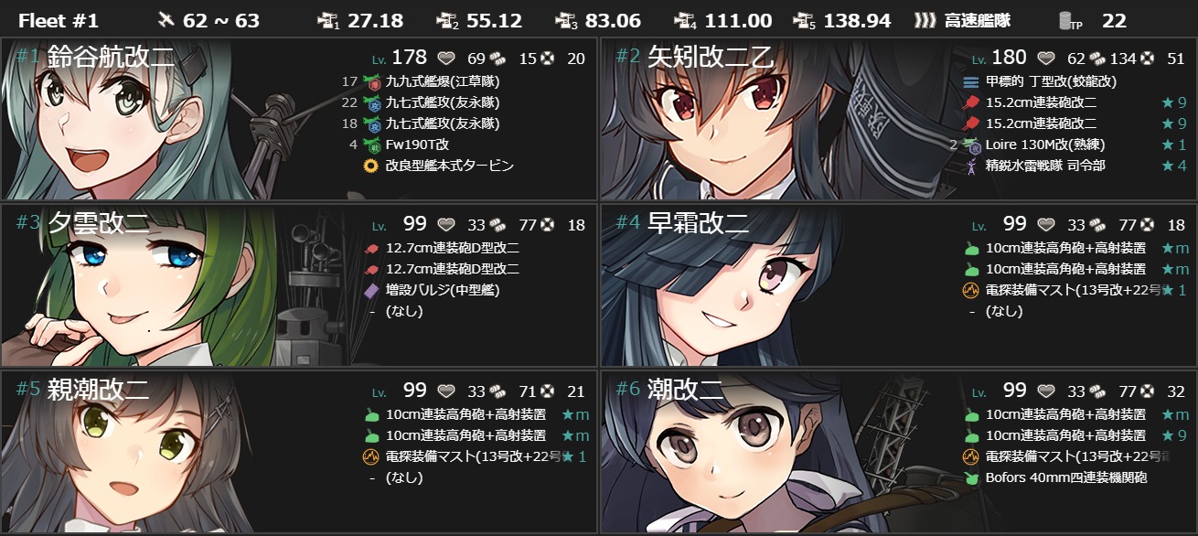 - [「親潮」「朝雲」「山雲」「霰」「朧」「漣」「潮」「曙」「夕雲」「早波」「浜波」「巻波」「岸波」「早霜」「谷風」「初風」4]+[自由枠2]で