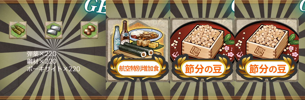 - 「開発資材×6」/「改修資材×2」/「航空特別増加食」