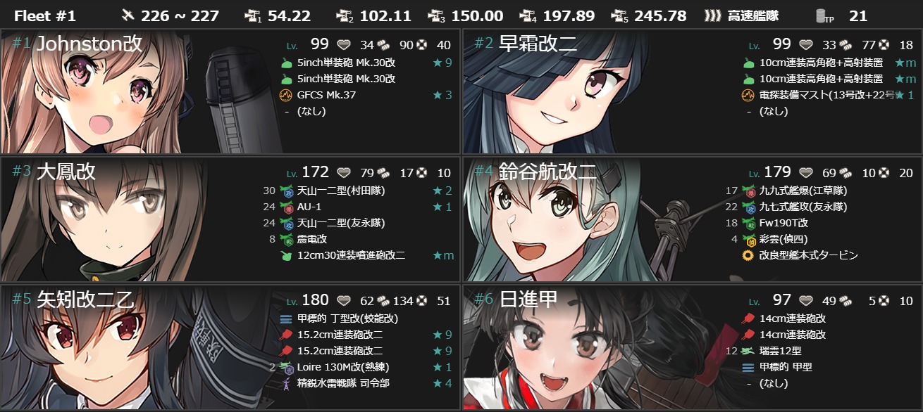 - 制空値 [#2-1]ボス到達時に制空値162↑あれば全戦闘で制空権確保になるのでそこを目安に。