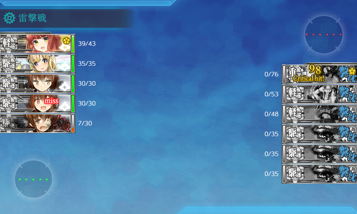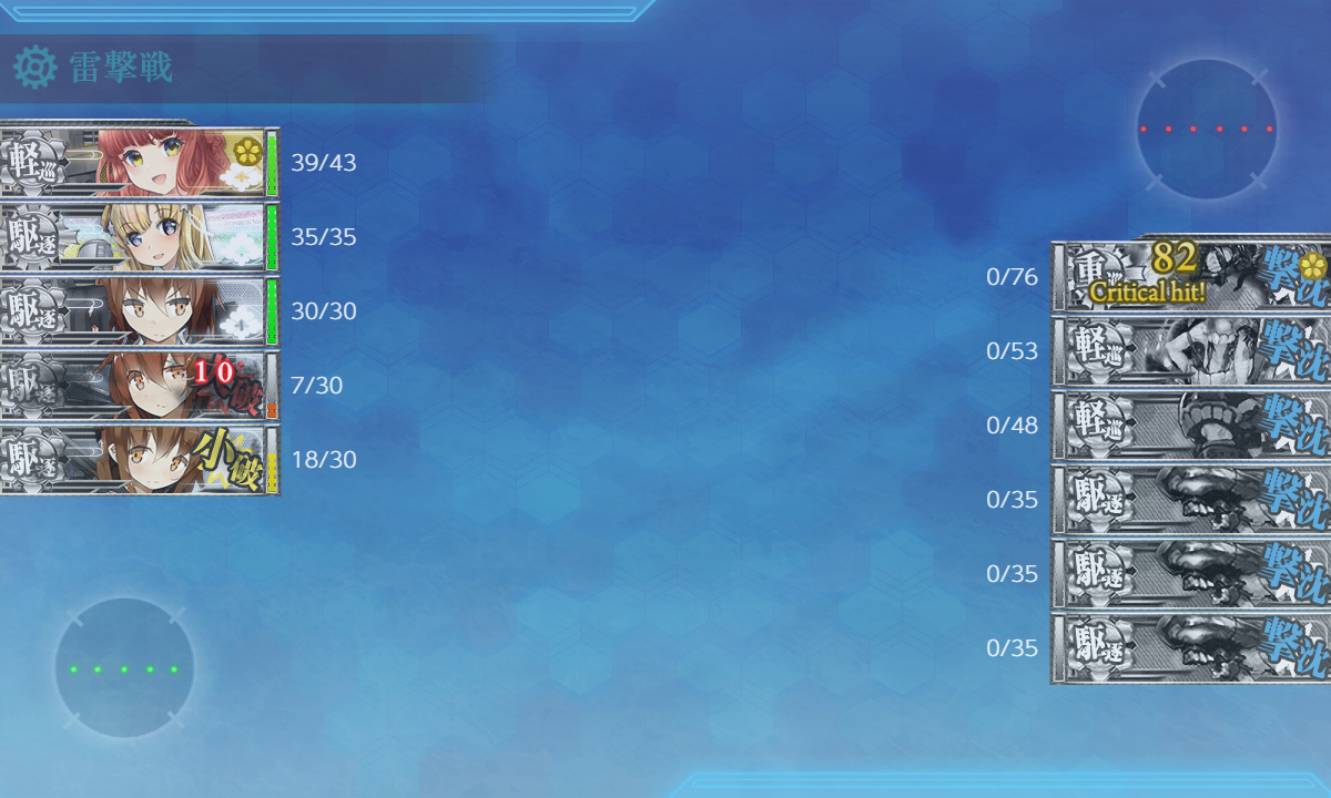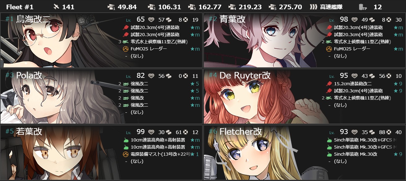 編成例を少しアレンジして那珂(Lv78)グレカーレ(Lv78)フレッチャー3隻目(Lv65)照月2隻目(Lv55)石垣(Lv61)
