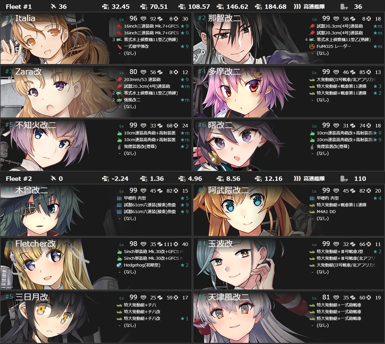 あとは穴埋めや火力役で「Italia」「Zara」。「Italia」の枠を"軽母"とか"駆逐"とかにすれば最短√も通れるはずですが増えるのが空襲戦(F)ですし"戦艦"を編成すれば道中(M,R)も安定するかなということで。