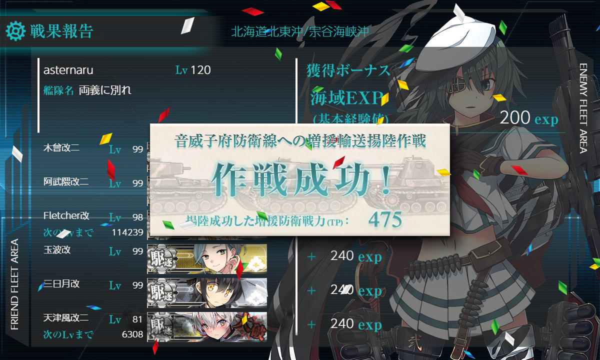 いつもの輸送海域と違って[特大発動艇+チハ改]とかにかなり大きいボーナスが載っているみたいでS勝利が取れるとがっつりTPが稼げるので装備が揃っている提督なら2回で終わらせられるんじゃないでしょうか(・◇・)
