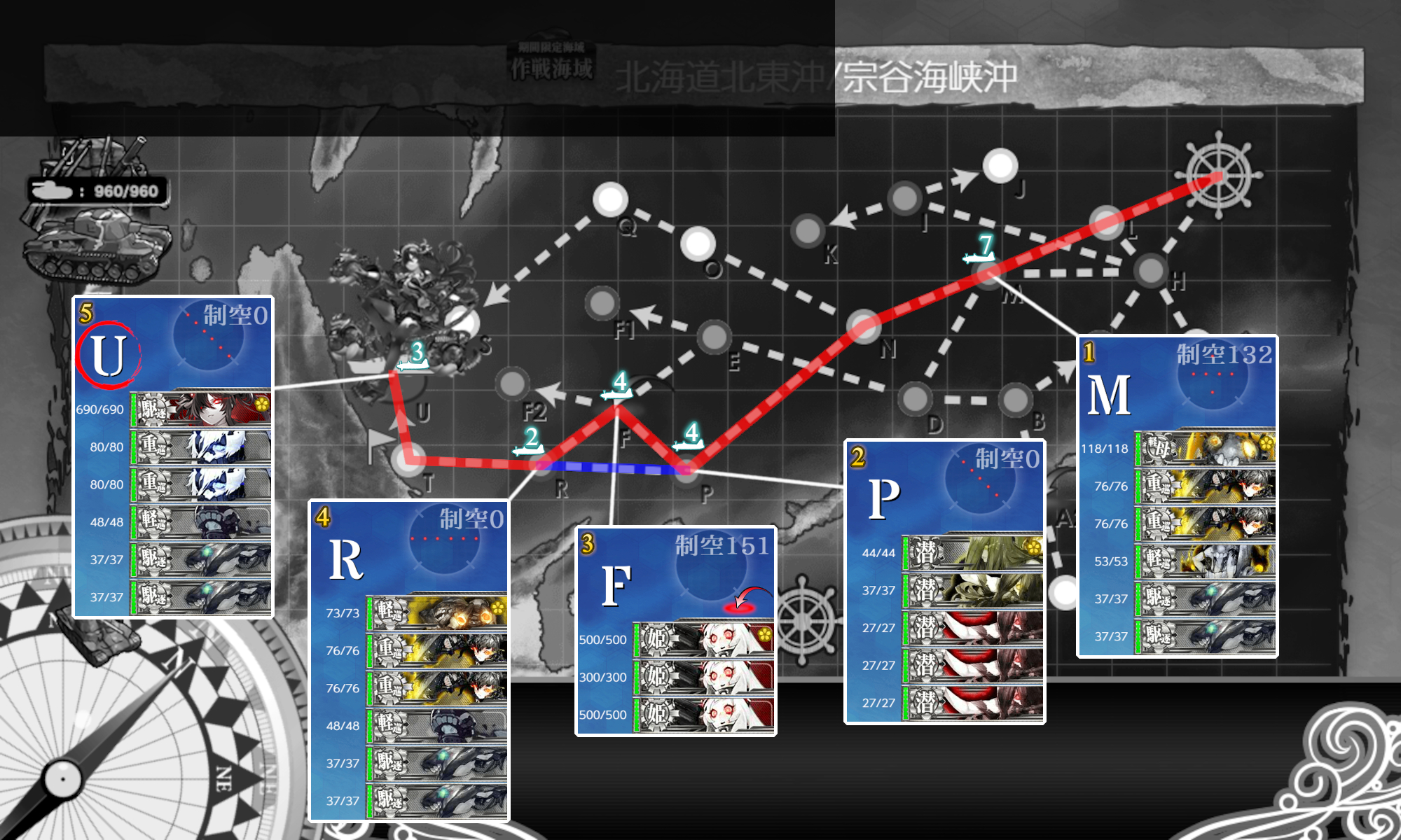 まずは『ゲージ削り』。という名の本攻略。"潜水艦"ボスにしては大分硬いのであっさりとはいきませんが対潜艦の被害少なめで到達出来れば撃破は狙えると思います。被害があったりT字不利でも半分は削れるかな?