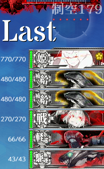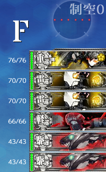 - 編成 "戦艦"を編成したりとか「那智」を編成したりとか色々考えたんですが道中だけでなくボス戦も[警戒陣]でいく戦術を取るのなら水雷戦隊編成が良いだろうということでかなり軽めな編成になりました。