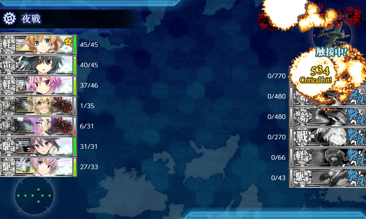 最初サブの阿武隈(増設なし)に甲標的/探照灯/北方迷彩となかなか苦しい積み方を強いて出撃させてたんですが、夜戦時のほかのメンバーのカットインが低くて惜しい場面が連発