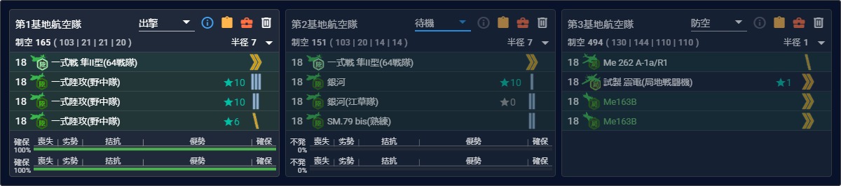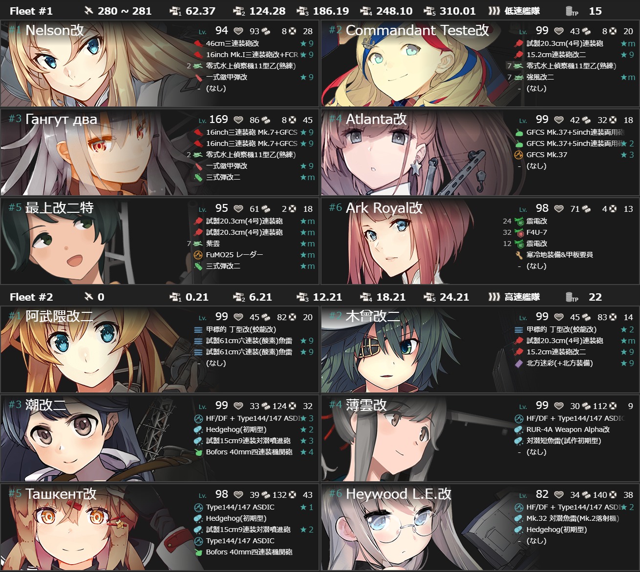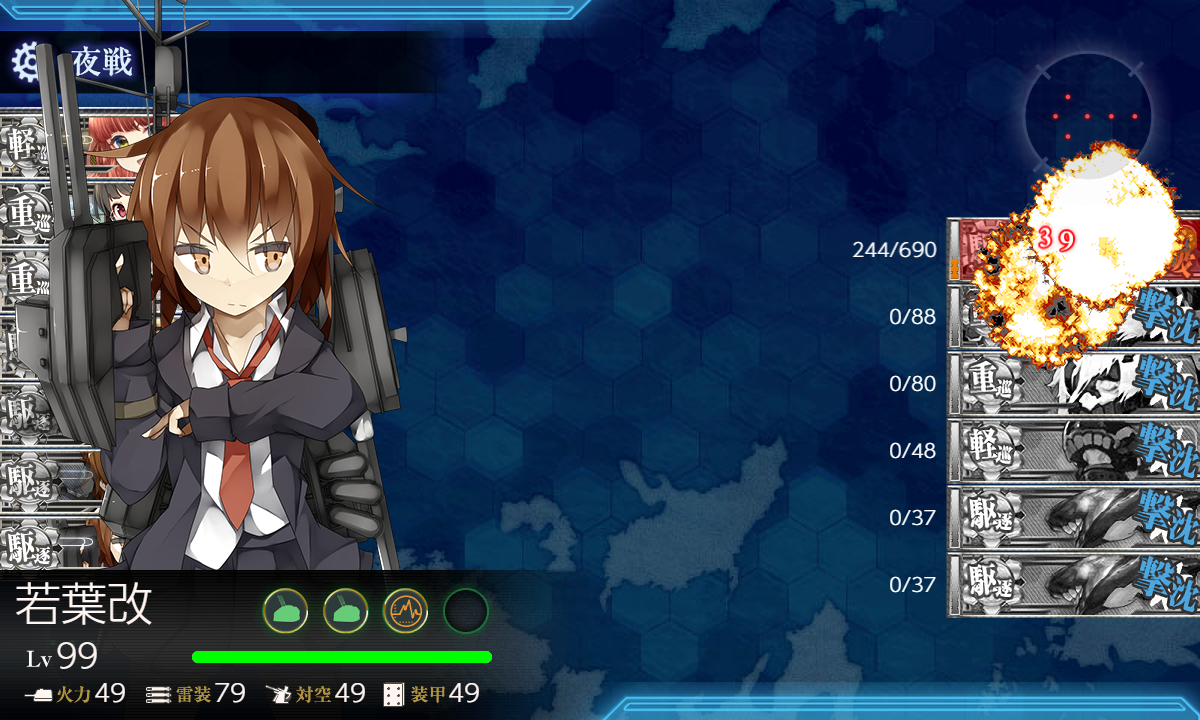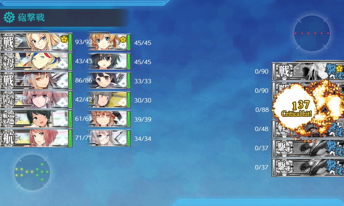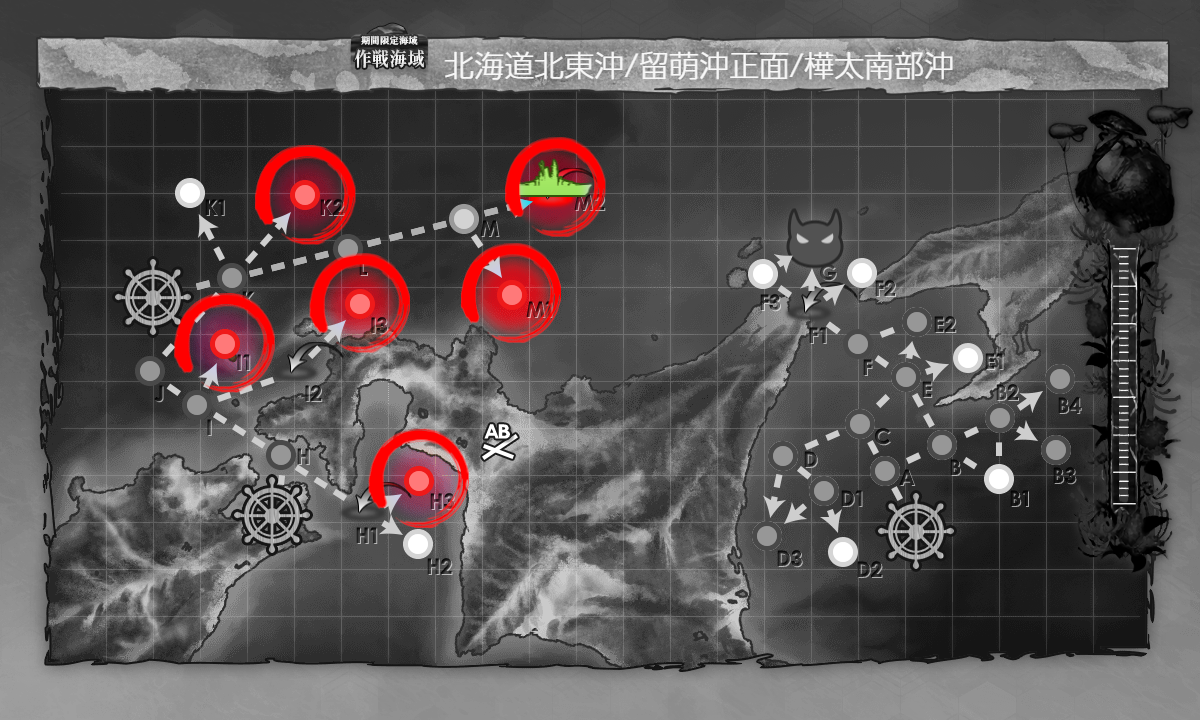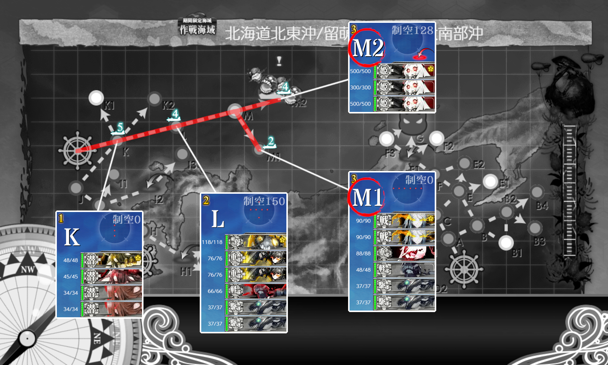2025年03月11日 16:00 2025春イベ #E3-2甲[海域拡張]【留萌沖艦隊決戦】 カテゴリ:onlineGAME艦隊これくしょん コメント数:コメント(2) #E3-2甲海域拡張H3マスS勝利×2:[第百四戦隊]I1マスA勝利↑×2:[第百四戦隊]I3マスS勝利×2:[第百四戦隊]K2マスA勝利↑×2:[第百四戦隊]M1マスS勝利:[連合艦隊]M2マス航空優勢↑:[連合艦隊][第百四戦隊]札をまた使うのはちょっと予想外でしたが特に難しい要素はないと思います。 手順1手順2手順3海域拡張←Click切替 H3マスS勝利×2+I1マスA勝利↑×2 まずは『H3マスS勝利×2+I1マスA勝利↑×2』。特筆する点なし。 編成(遊撃部隊)/お札[第百四戦隊]▼Click 編成[第百四戦隊]札が付いた艦を適当に。 次の手順もそうですが"戦艦"や"空母"を編成しても良いので戦力を追加してもok。 この手順では低速混在である必要があるので適当に"海防"を混ぜてます(・◇・) 制空値メインは対"潜水艦"なので適当に。 お札[第百四戦隊] サブ「鳥海」「Pola」「Fletcher」 基地航空隊不要なので【防空】以外は【退避】で放置。[I]マスに適当に送ってもok。 画像は1枚ずつですが各2回ずつやってます。 I3マスS勝利×2+K2マスA勝利↑×2 次は『I3マスS勝利×2+K2マスA勝利↑×2』。[北方迷彩(+北方装備)]搭載艦が分岐条件っぽい? 編成(遊撃部隊)/お札[第百四戦隊]▼Click 編成[北方迷彩(+北方装備)]搭載艦(2↑?)で[I]マスから分岐するようなので[K2]マスへ行くときは[北方迷彩(+北方装備)]を搭載(2)して[I3]マスへ行くときは外して別の装備(電探等)にしましょう(。・Д・)ゞ 正確には[北方迷彩(+北方装備)]非搭載艦で判断されているようなので5人編成なら[北方迷彩(+北方装備)]は不要みたい。 制空値なんとかなるだろうとスルー。 お札[第百四戦隊] サブ「鳥海」「Pola」「Fletcher」 基地航空隊 第一航空隊:【I3,K2マス】に集中。必要行動半径は【3,5】 第二航空隊:【退避】。 第三航空隊:【防空】。 [I3,K2]マスに1部隊送るだけ。第二航空隊を[I]マスに送ったり[東海]部隊にして[J,K]マスに送ってもok。 画像は1枚ずつですが各2回ずつやってます。 M1マスS勝利+M2マス航空優勢↑ 最後は『M1マスS勝利+M2マス航空優勢↑』。[#E3-2]本攻略編成を考えてからその編成を流用すると吉。 編成(水上打撃部隊)/お札[連合艦隊]▼Click 編成「大和」を編成するか迷いましたが恐らく過剰ということで「Nelson」編成にしました。 「長門,陸奥」編成も考えましたが「Гангут」を活かすなら「Nelson」かなということで。まぁお好みで。 制空値空襲戦(M2)で航空優勢↑が取れるように到達時に制空値192↑が目安かな? お札[連合艦隊] サブ「Nelson」「Commandant Teste」「Atlanta」「最上」「Ark Royal」「阿武隈」「Ташкент」「Heywood L.E.」 基地航空隊 第一航空隊:【M1マス】に集中。必要行動半径は【2】 第二航空隊:【Lマス】に集中。必要行動半径は【4】 第三航空隊:【防空】。 [M2]マスに航空優勢を取りに行くときは[M1]マスに送る必要はないので【退避】に。 海域拡張これでボスマスとそこに続く航路が出てきたので[#E3-2]本攻略開始になります(。・Д・)ゞ タグ :#艦これ#艦これイベント#前段作戦#海域拡張 艦隊これくしょん(艦これ)ランキングに参加しています。クリックして頂けると励みになります(。・Д・)ゞ 「onlineGAME」カテゴリの最新記事 コメント コメント一覧 (2) 1. まほろ 2025年03月25日 01:51 報告します. E-3甲攻略中ですが,I1マスA1回S1回でギミック音を確認しました. 0 naru がしました 2. naru 2025年03月28日 20:31 >>1 修正しました(。・Д・)ゞコメントありがとうございます。 0 naru がしました コメントフォーム 名前 コメント 記事の評価 リセット リセット 顔 星 情報を記憶 コメントを投稿する 2025春イベ #E3-1甲[vs北方水姫]【留萌沖艦隊決戦】2025春イベ #E3-2甲[vs輸送ワ級II(揚陸中)]【留萌沖艦隊決戦】