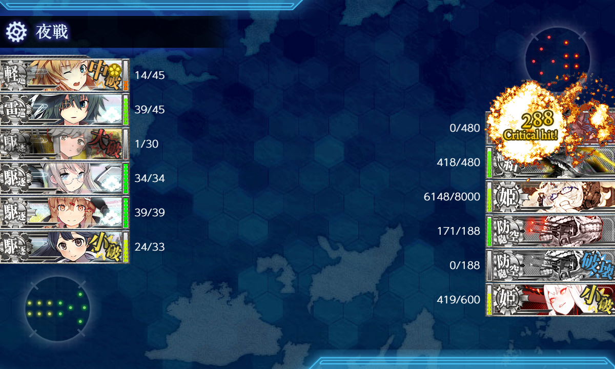 最終形態では"集積地棲姫IV"が[壊]になるのは大差ないんですが第二艦隊が強化されて下手すると第一艦隊との夜戦権が得られないので決戦支援を送ってそこを対策するのが無難かなと思います。最終形態でも狙い自体は一緒で昼戦で出来るだけ第一艦隊を減らしてあとは夜戦で誰かが旗艦を狙うのを待つだけ。そんな感じで楽勝という訳ではないんですが道中が比較的安定しているので最終形態になってから何度かボスに到達すればクリア出来ると思います。
