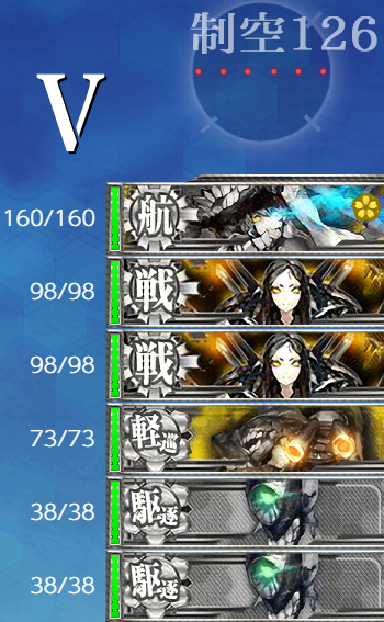 体感としては[#E2-2]のボス前(V)を少し超えるぐらい?攻略時は"戦艦"3のはずなので多少は何とかなりますが装甲破砕時は"戦艦"2編成になると思うのでその時は[煙幕]がないと厳しい気がします。攻略時にも[煙幕]を使うのも一考。