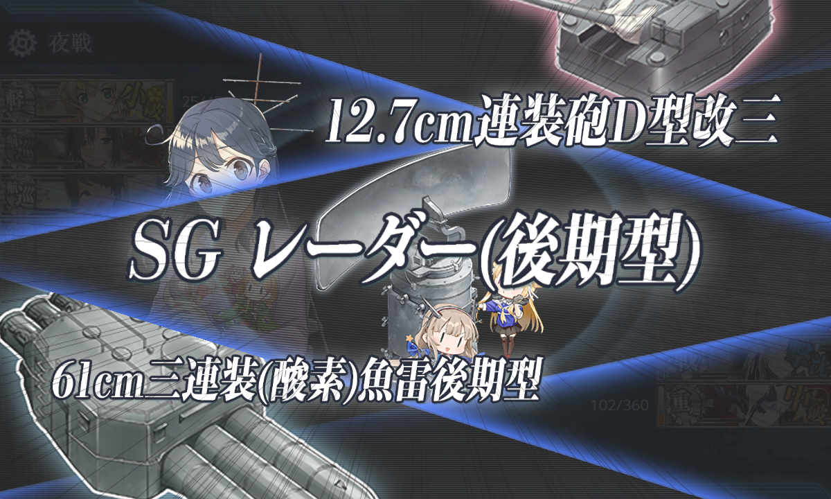 あとは[北方迷彩(+北方装備)]の特効倍率付与はどうやら★7↑限定?っぽいので使ってませんが3個目があるのなら「Ташкент」の[照明弾]→[北方迷彩(+北方装備)]にした方が良いかも知れません。