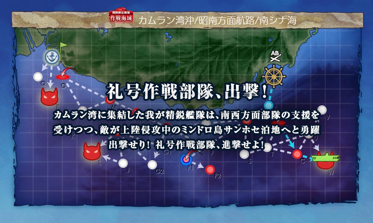 - 編成 [礼号作戦部隊]札ということで礼号組や主力を投入。この先を考えると"空母"は誰でも?