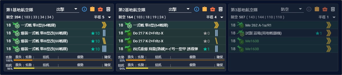 "空母"2編成とかでそこまで稼げない場合は基地航空隊の制空値を盛って航空拮抗×4にする感じかな?