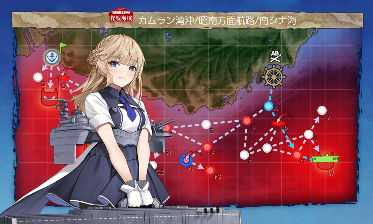 編成割愛。なんでも良さげ。装甲空母が相性良いですが瑞鶴翔鶴を5-1に採用する案あり?ちょっと整理しきれずだったので私は前回改装したサブでクリア。戦闘の流れが悪いと一方的になる可能性はありますが装甲空母じゃなくてもそんなに回数重ねなくてもクリアは出来そうな手ごたえ。ただし杉と榧ですね。。。ルート固定に必要なのか?(ほかの手段があるのか。杉でも良いのかの情報待ちですね。が、探さざるを得ない。)
