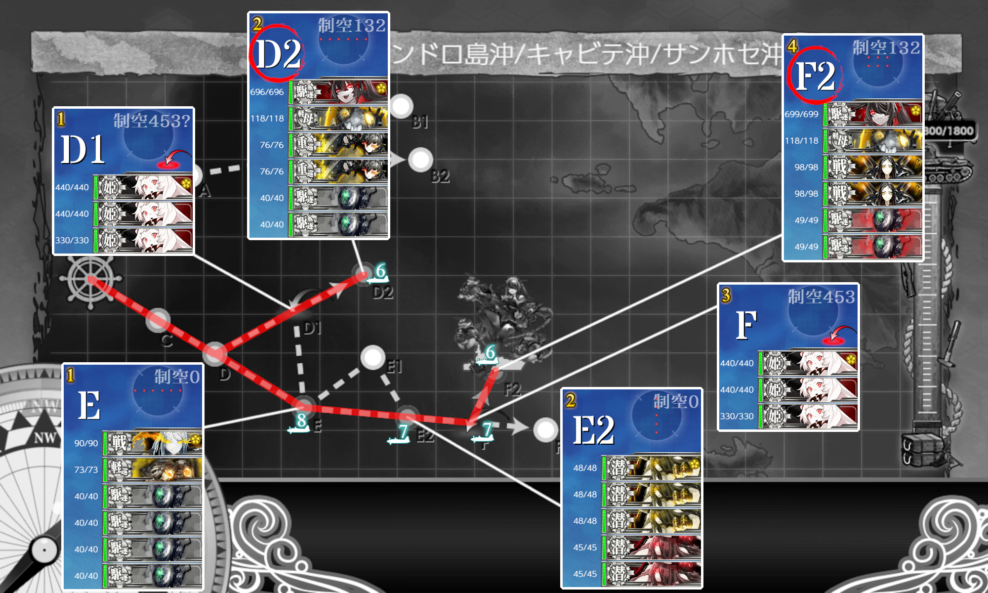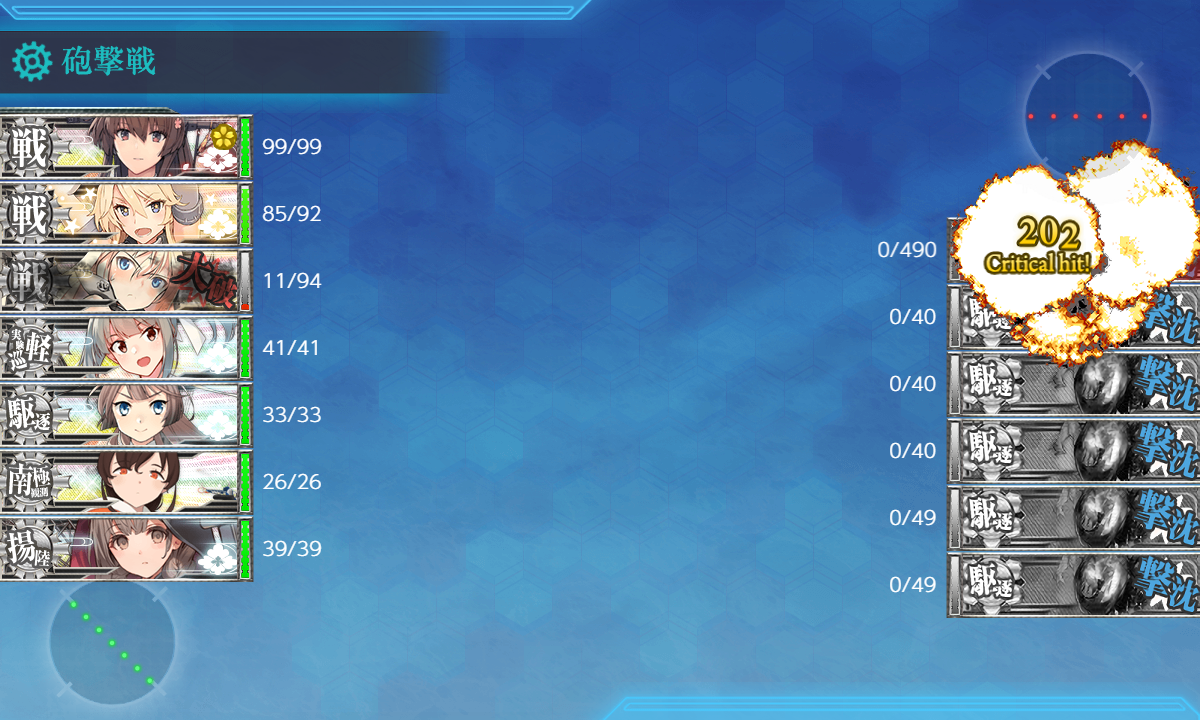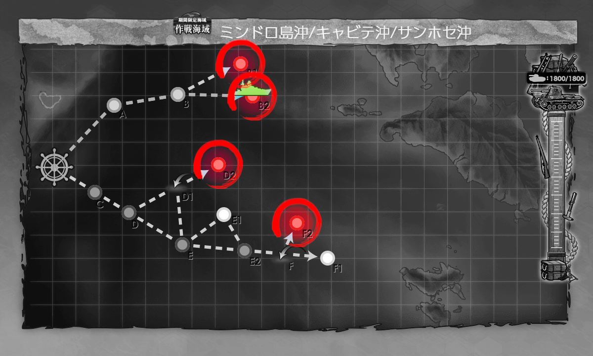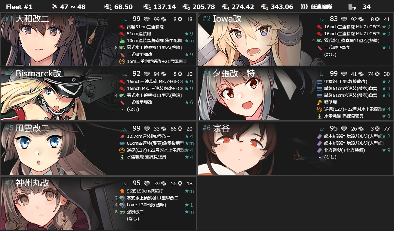 2025年03月26日 18:30 2025春イベ #E5-1甲[海域拡張]【第二次礼号作戦】 カテゴリ:onlineGAME艦隊これくしょん コメント数:コメント(2) #E5-1甲海域拡張[#E5]もまずは海域拡張から(。・Д・)ゞこのギミックはどうとでもなりますがその先は本当の地獄……。 D2マスS勝利:[第三十一戦隊]F2マスS勝利×2:[第三十一戦隊]B1マスS勝利:[キャビテ増援部隊]B2マスS勝利:[キャビテ増援部隊][F2]マスが道中含めちょっと厄介なぐらい? 手順1手順2海域拡張←Click切替 D2マスS勝利+F2マスS勝利×2 まずは『D2マスS勝利+F2マスS勝利×2』。ここだけのお札ですが[F2]マスはそこそこなので多少の戦力は欲しい。 編成(遊撃部隊)/お札[第三十一戦隊]▼Click 編成[通常艦隊]でもいけるみたいですが[F2]マスを考えると1人でも多い方が良いので一応[遊撃部隊]で。 [煙幕]は[F2]マスへ行くときの潜水戦(E2)用。[D2]マスへ行くときはなくてもok。 一応"雷巡"を編成しましたが魚雷CI"駆逐"が2人いれば充分な感じだったのでサブがいなければ無理に編成する程では。 制空値道中の[E]マスの"ヲ級改"パターンの航空優勢↑が制空値198↑なのでそこを目安にしましたがこの段階だと出ないかも? ただそこまで稼げば[D2],[F2]マスは基地航空隊の削りと合わせて航空優勢↑が取れるはずなので。 お札[第三十一戦隊] サブ「Roma」「飛龍」「照月」「Sheffield」「雪風」「大井」 基地航空隊 第一航空隊:【D2,F2マス】に集中。必要行動半径は【6,6】 第二航空隊:【退避】。 第三航空隊:【防空】。 [#E5]はしばらく1部隊しか送れないので第二航空隊は【退避】で放置。 B1,B2マスS勝利 次は『B1,B2マスS勝利』。難しい点はないですが[キャビテ増援部隊]札は[#E5-1]攻略札なのでそこで誰を編成するか。 編成(遊撃部隊)/お札[キャビテ増援部隊]▼Click 編成ここも[遊撃部隊]なので[第三十一戦隊]札と混ざらないように注意! とりあえず"戦艦"3↑(+"軽巡"1↑?)だと[キャビテ増援部隊]札になるようなので適当な"戦艦"3+"軽巡"1に[第三十一戦隊]札が付いた"駆逐"を混ぜて出撃出来ないのを確認して[第三十一戦隊]札が付いた"駆逐"を札が付いてない駆逐に変えて出撃すれば上√に進んで[キャビテ増援部隊]札が付くはずです。最初"戦艦"3+「浜風」だと出撃出来る状態だったので注意? 肝心の編成は[#E5-1]も色々な編成が開拓されていますが「大和」を編成するのが良さそうな気はするので一応投入。 とりあえず高速統一でやってみようかなということで[改二]と「Iowa」。「Bismarck」はとりあえずの数合わせ。 "揚陸(補給)艦"2↑も√条件にありそうということでここでは何の意味もないですが「宗谷」+「神州丸」。 制空値どっちも制空値0なので何でもok。 お札[キャビテ増援部隊] サブ「大和」「Iowa」「Bismarck」「夕張」「宗谷」「神州丸」 基地航空隊 第一航空隊:【B1,B2マス】に集中。必要行動半径は【4,4】 第二航空隊:【退避】。 第三航空隊:【防空】。 海域拡張これでボスマスとそこに続く航路が出現して[#E5-1]本攻略開始になります(。・Д・)ゞ [#E4-2]を遥かに上回る地獄の輸送海域ということなので覚悟して臨みます。 タグ :#艦これ#艦これイベント#2025春イベント#後段作戦#海域拡張 艦隊これくしょん(艦これ)ランキングに参加しています。クリックして頂けると励みになります(。・Д・)ゞ 「onlineGAME」カテゴリの最新記事 コメント コメント一覧 (2) 1. カミーユ 2025年03月26日 19:23 本当ですか❓E4-2甲作戦で只今攻略に詰まってるのに•••(T_T) 0 naru がしました 2. naru 2025年03月28日 20:50 >>1 [#E4-2]を1,2段階スケールアップしたような海域ですかねぇ_(:3 」∠ )_ まぁ戦力を出し惜しまなければ[#E4-2]と同じくらいの感覚で攻略は出来るかも知れません。 0 naru がしました コメントフォーム 名前 コメント 記事の評価 リセット リセット 顔 星 情報を記憶 コメントを投稿する 2025春イベ #E4-3甲[vs駆逐ラ級β]【南沙諸島沖の戦雲】2025春イベ #E5-1甲[vs軽巡新棲姫]【第二次礼号作戦】