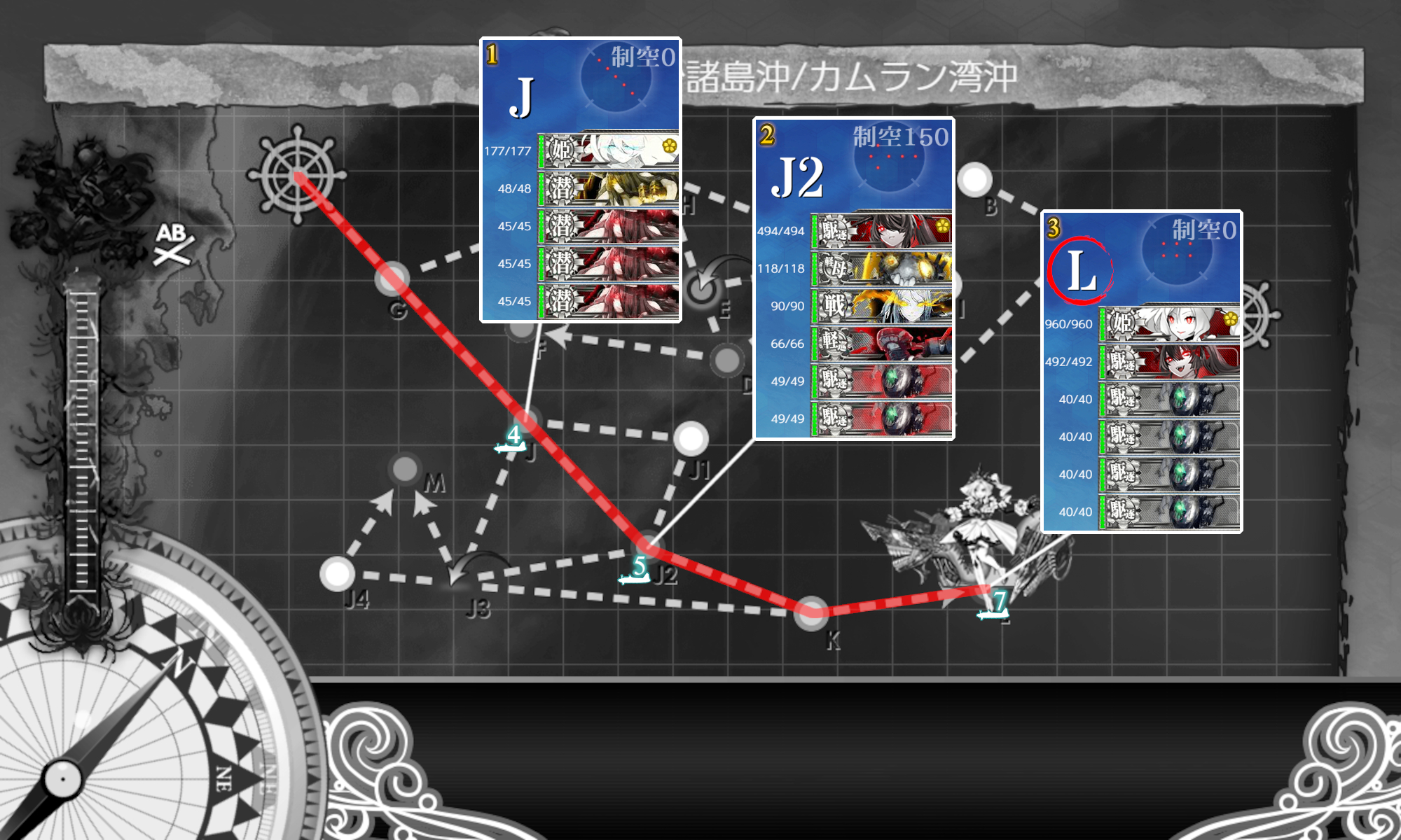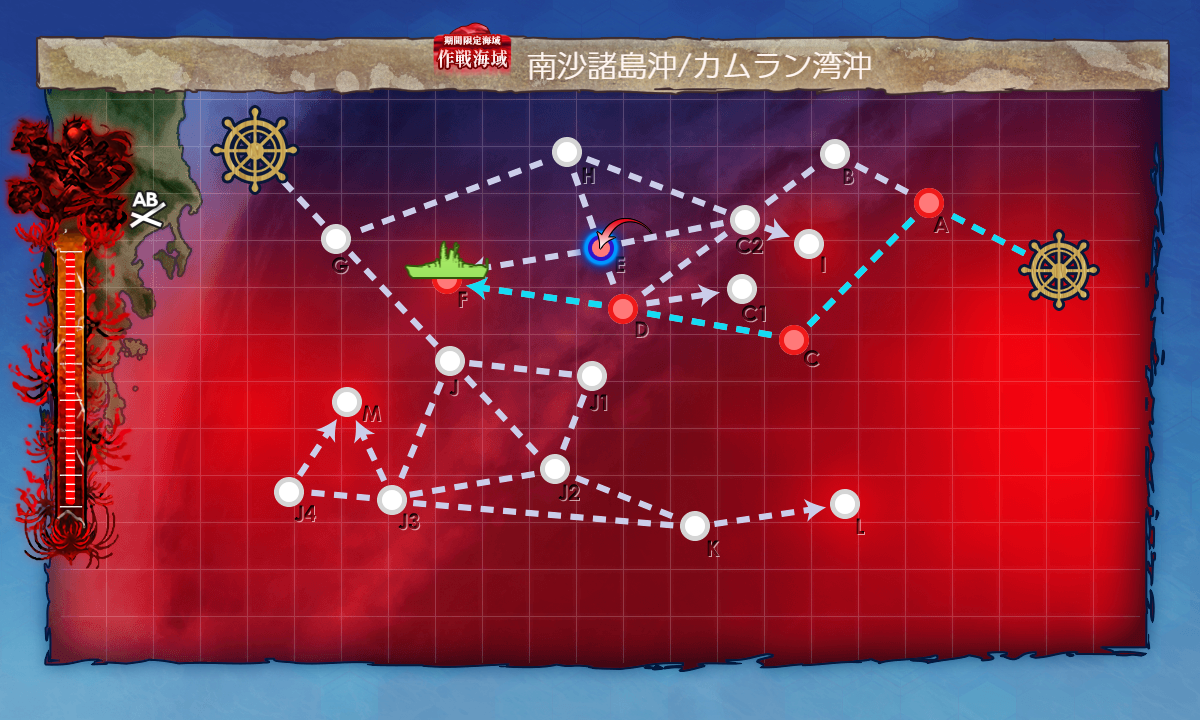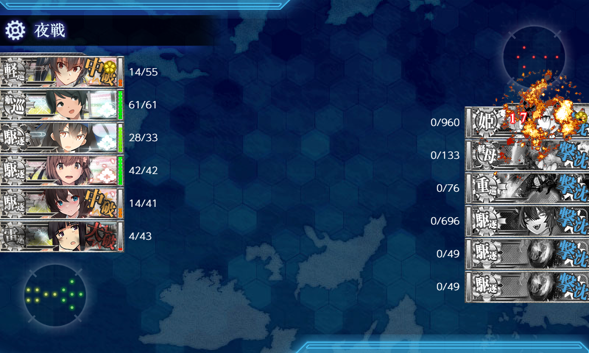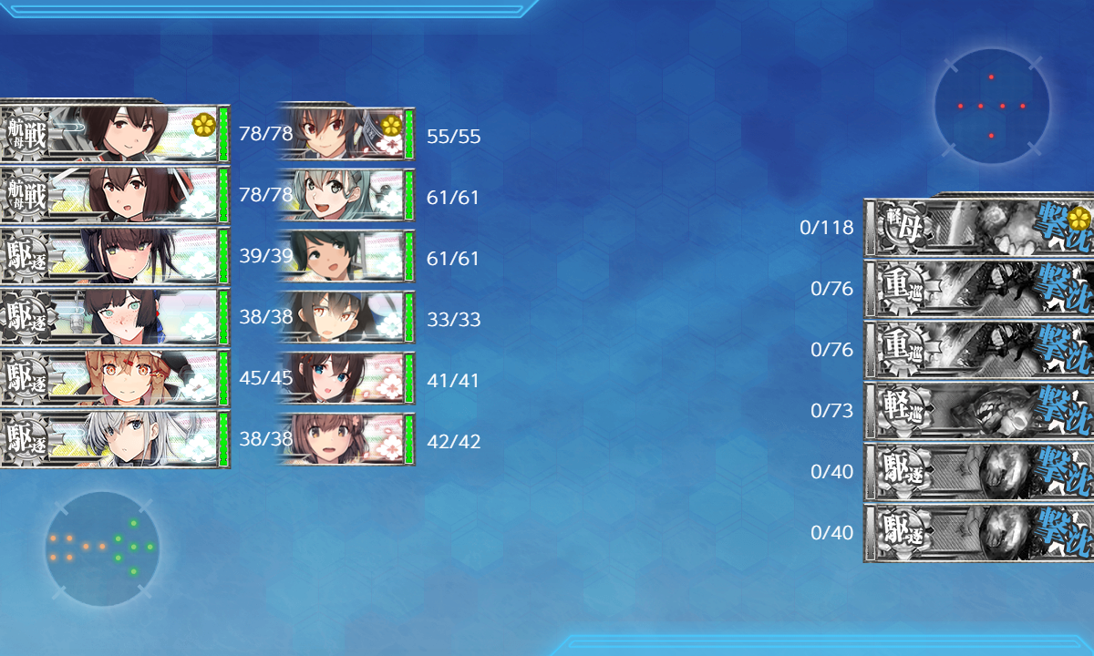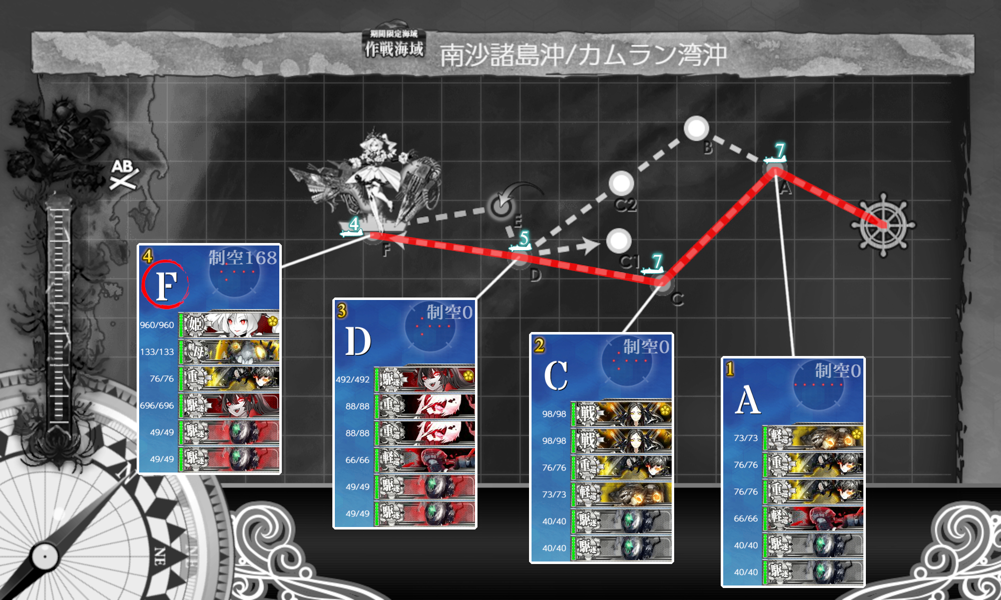 2025年03月30日 22:00 2025春イベ #E6-1甲[海域拡張]【第二遊撃部隊の帰投】 カテゴリ:onlineGAME艦隊これくしょん コメント数:コメント(0) #E6-1甲海域拡張×2さてさて今イベントもついに最終海域ですが例によって例の如くまずは海域拡張から(。・Д・)ゞ FマスS勝利×3:[礼号作戦部隊]MマスS勝利×2:[第四航空戦隊]LマスS勝利×2:[第四航空戦隊]IマスS勝利×2:[第四航空戦隊]最終形態でどうするかは置いといて[#E6-1]は最初"輸送護衛部隊"で攻略する予定なので[M]マスを最後にすることも考えたんですが万が一にも[礼号作戦部隊]札が[#E6-1]攻略用の艦娘に付くと厄介なので紛れが起きにくい[M]マスから。 色々試しましたが恐らく"輸送護衛部隊"編成で出撃したら[第四航空戦隊]札が付くようになっているはずなので(。・Д・)ゞ やることは単純ですが"軽巡新棲姫"と"ラ級"ばかりなので難易度はなかなか。特に[F,I]マスは警戒陣が厄介……。 手順1海域拡張①手順2手順3手順4海域拡張②←Click切替 FマスS勝利×3 まずは『FマスS勝利×3』。[F]マスで警戒陣を使われるとちょっと厄介_(:3 」∠ )_ 編成(水上打撃部隊)/お札[礼号作戦部隊]▼Click 編成先行勢は"遊撃部隊"でやっていたようですが"水上打撃部隊"でも良いので少し楽になっているはず。 それこそ[F]マスで警戒陣を使われて1回ギリギリだったのでこれが"遊撃部隊"だったらA勝利止まりだったはず。 まぁ"遊撃部隊"onlyだったら後に編成するであろう「大和」を投入してどうにかしていたかな? ちなみにこの√を通るには[戦艦+空母2↓]+[軽巡2↑?]+[駆逐6↑?]+[索敵値]かな? もしかしたら[史実艦(礼号組)]の数もあるかも知れません。私は5人編成してます(・◇・) 制空値基地航空隊もあるので過剰ですが32スロでも3割ぐらいは枯れるので[艦戦]多め。 お札[礼号作戦部隊] サブ「赤城」「天霧」「初月」「北上」「矢矧」「天津風」「霞」 「赤城」「初月」「矢矧」「天津風」はメインですが他にサブあり。 基地航空隊 第一航空隊:【Fマス】に集中。必要行動半径は【4】 第ニ航空隊:【Fマス】に集中。必要行動半径は【4】 第三航空隊:【退避】。 2部隊送れば充分なはず。[東海]部隊はこの後で使うので【退避】で放置。 海域拡張①これで新しいスタート地点と航路が広がりますがまだボスマスがないので引き続き海域拡張をしていきます(。・Д・)ゞ MマスS勝利×2 次は『MマスS勝利×2』。この[M]マスの奥が[#E6-1]ボスに繋がるので後の攻略編成を考えて組むと吉。 編成(輸送護衛部隊)/お札[第四航空戦隊]▼Click 編成 "輸送護衛部隊"編成なら[第四航空戦隊]札が付くはずですが不安な提督は一度適当な"駆逐,軽巡"で"輸送護衛部隊"を組んでそこに[礼号作戦部隊]札の艦を混ぜて出撃出来ないのを確認して札が付いてない"駆逐"に変えて出撃すれば確実。 編成自体は"輸送護衛部隊"編成で出来るだけ戦力を盛っただけ(・◇・) 攻略とか次の手順を考えていたので[煙幕]を持たせてますがここでは使いません。 制空値攻略時にはまた調整するかも知れませんが[M]マス到達時に制空値198↑あれば航空優勢になるのでそこを目安に。 お札[第四航空戦隊] サブ「伊勢」「鈴谷」「最上」 「伊勢」「鈴谷」「最上」はメインですが他にサブあり。 基地航空隊 第一航空隊:【退避】。 第ニ航空隊:【退避】。 第三航空隊:【Jマス】に集中。必要行動半径は【4】 今度は第一,ニ航空隊が不要なので【退避】で放置。 LマスS勝利×2 次は『LマスS勝利』。[第四航空戦隊]札艦隊で"水上打撃部隊"編成にするだけ。 編成(水上打撃部隊)/お札[第四航空戦隊]▼Click 編成"輸送護衛部隊"編成に"戦艦","軽空","雷巡"を追加して色々調整しただけ。[煙幕]は2戦目(J2)の"ラ級"マスで使用。 もっと適当でもいけますが[#E6-1]最終形態では"水上打撃部隊"編成にするかも知れないので「北上」とかを一応追加。 制空値2戦目(J2)で航空優勢が取れる制空値225↑まで稼げば何でも。 お札[第四航空戦隊] サブ「Rodney」「龍鳳」「伊勢」「鈴谷」「最上」 「伊勢」「最上」はメインですが他にサブあり。「鈴谷」は"軽空"形態あり。 基地航空隊 第一航空隊:【Lマス】に集中。必要行動半径は【7】 第ニ航空隊:【Lマス】に集中。必要行動半径は【7】 第三航空隊:【Jマス】に集中。必要行動半径は【4】 IマスS勝利×2 最後は『IマスS勝利×2』。[高速+]√が開拓されたので編成が組めると少し楽。ただここも警戒陣編成があるので……。 編成(水上打撃部隊)/お札[第四航空戦隊]▼Click 編成この段階なら"戦艦"3でも良いので手順3編成を[高速+]化すれば良いんですけど後で来る時には"戦艦"2+"空母"1編成じゃないと駄目っぽいのでこの段階からそっちに合わせた編成になってます。最初は"空母"枠を先の手順で編成した「龍鳳」にしようと思っていたんですけど[高速+]化するならと「加賀」を編成。 結構火力がギリギリだったので2回目から「北上」→「霞」にして夜戦要員を増やしました。 "軽巡新棲姫"と"ラ級γ"は昼戦では落とせず夜戦で落とさないといけないので[高速+]と"雷巡"は相性が良く