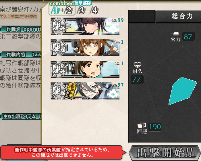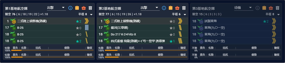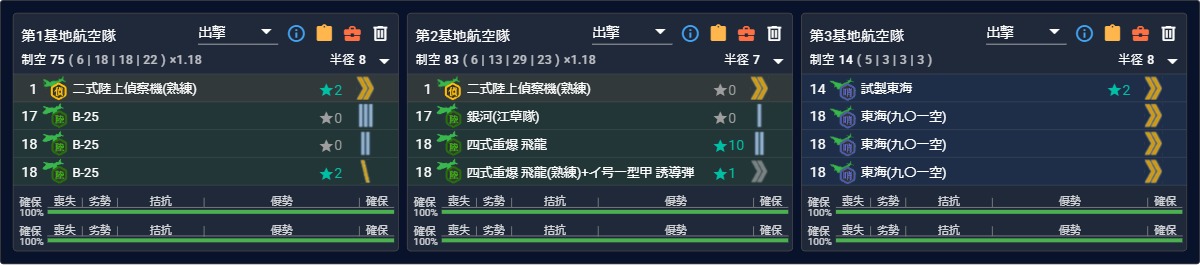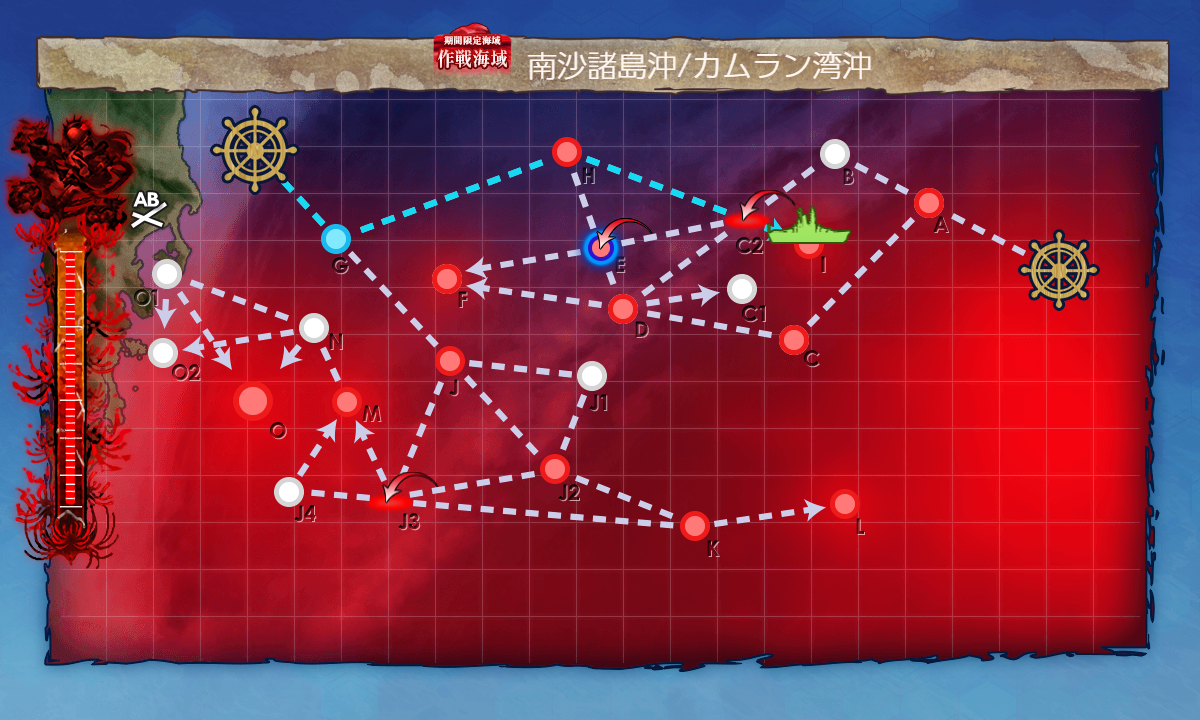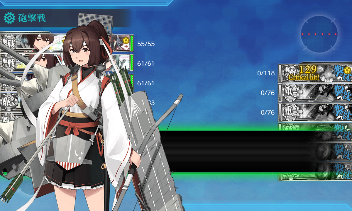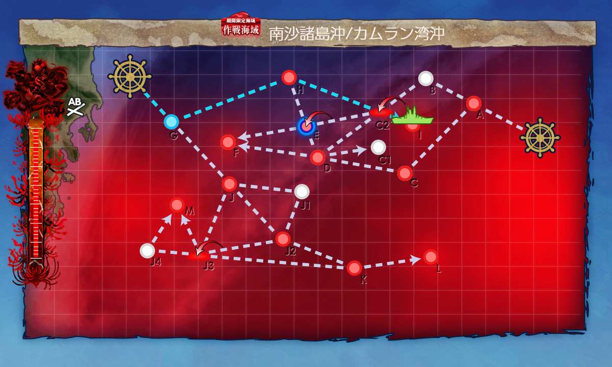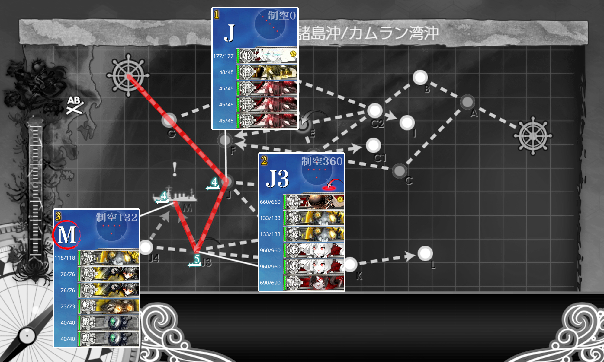 2025年03月30日 22:00 2025春イベ #E6-1甲[海域拡張]【第二遊撃部隊の帰投】 カテゴリ:onlineGAME艦隊これくしょん コメント数:コメント(0) #E6-1甲海域拡張×2さてさて今イベントもついに最終海域ですが例によって例の如くまずは海域拡張から(。・Д・)ゞ FマスS勝利×3:[礼号作戦部隊]MマスS勝利×2:[第四航空戦隊]LマスS勝利×2:[第四航空戦隊]IマスS勝利×2:[第四航空戦隊]最終形態でどうするかは置いといて[#E6-1]は最初"輸送護衛部隊"で攻略する予定なので[M]マスを最後にすることも考えたんですが万が一にも[礼号作戦部隊]札が[#E6-1]攻略用の艦娘に付くと厄介なので紛れが起きにくい[M]マスから。 色々試しましたが恐らく"輸送護衛部隊"編成で出撃したら[第四航空戦隊]札が付くようになっているはずなので(。・Д・)ゞ やることは単純ですが"軽巡新棲姫"と"ラ級"ばかりなので難易度はなかなか。特に[F,I]マスは警戒陣が厄介……。 手順1海域拡張①手順2手順3手順4海域拡張②←Click切替 FマスS勝利×3 まずは『FマスS勝利×3』。[F]マスで警戒陣を使われるとちょっと厄介_(:3 」∠ )_ 編成(水上打撃部隊)/お札[礼号作戦部隊]▼Click 編成先行勢は"遊撃部隊"でやっていたようですが"水上打撃部隊"でも良いので少し楽になっているはず。 それこそ[F]マスで警戒陣を使われて1回ギリギリだったのでこれが"遊撃部隊"だったらA勝利止まりだったはず。 まぁ"遊撃部隊"onlyだったら後に編成するであろう「大和」を投入してどうにかしていたかな? ちなみにこの√を通るには[戦艦+空母2↓]+[軽巡2↑?]+[駆逐6↑?]+[索敵値]かな? もしかしたら[史実艦(礼号組)]の数もあるかも知れません。私は5人編成してます(・◇・) 制空値基地航空隊もあるので過剰ですが32スロでも3割ぐらいは枯れるので[艦戦]多め。 お札[礼号作戦部隊] サブ「赤城」「天霧」「初月」「北上」「矢矧」「天津風」「霞」 「赤城」「初月」「矢矧」「天津風」はメインですが他にサブあり。 基地航空隊 第一航空隊:【Fマス】に集中。必要行動半径は【4】 第ニ航空隊:【Fマス】に集中。必要行動半径は【4】 第三航空隊:【退避】。 2部隊送れば充分なはず。[東海]部隊はこの後で使うので【退避】で放置。 海域拡張①これで新しいスタート地点と航路が広がりますがまだボスマスがないので引き続き海域拡張をしていきます(。・Д・)ゞ MマスS勝利×2 次は『MマスS勝利×2』。この[M]マスの奥が[#E6-1]ボスに繋がるので後の攻略編成を考えて組むと吉。 編成(輸送護衛部隊)/お札[第四航空戦隊]▼Click 編成 "輸送護衛部隊"編成なら[第四航空戦隊]札が付くはずですが不安な提督は一度適当な"駆逐,軽巡"で"輸送護衛部隊"を組んでそこに[礼号作戦部隊]札の艦を混ぜて出撃出来ないのを確認して札が付いてない"駆逐"に変えて出撃すれば確実。 編成自体は"輸送護衛部隊"編成で出来るだけ戦力を盛っただけ(・◇・) 攻略とか次の手順を考えていたので[煙幕]を持たせてますがここでは使いません。 制空値攻略時にはまた調整するかも知れませんが[M]マス到達時に制空値198↑あれば航空優勢になるのでそこを目安に。 お札[第四航空戦隊] サブ「伊勢」「鈴谷」「最上」 「伊勢」「鈴谷」「最上」はメインですが他にサブあり。 基地航空隊 第一航空隊:【退避】。 第ニ航空隊:【退避】。 第三航空隊:【Jマス】に集中。必要行動半径は【4】 今度は第一,ニ航空隊が不要なので【退避】で放置。 LマスS勝利×2 次は『LマスS勝利』。[第四航空戦隊]札艦隊で"水上打撃部隊"編成にするだけ。 編成(水上打撃部隊)/お札[第四航空戦隊]▼Click 編成"輸送護衛部隊"編成に"戦艦","軽空","雷巡"を追加して色々調整しただけ。[煙幕]は2戦目(J2)の"ラ級"マスで使用。 もっと適当でもいけますが[#E6-1]最終形態では"水上打撃部隊"編成にするかも知れないので「北上」とかを一応追加。 制空値2戦目(J2)で航空優勢が取れる制空値225↑まで稼げば何でも。 お札[第四航空戦隊] サブ「Rodney」「龍鳳」「伊勢」「鈴谷」「最上」 「伊勢」「最上」はメインですが他にサブあり。「鈴谷」は"軽空"形態あり。 基地航空隊 第一航空隊:【Lマス】に集中。必要行動半径は【7】 第ニ航空隊:【Lマス】に集中。必要行動半径は【7】 第三航空隊:【Jマス】に集中。必要行動半径は【4】 IマスS勝利×2 最後は『IマスS勝利×2』。[高速+]√が開拓されたので編成が組めると少し楽。ただここも警戒陣編成があるので……。 編成(水上打撃部隊)/お札[第四航空戦隊]▼Click 編成この段階なら"戦艦"3でも良いので手順3編成を[高速+]化すれば良いんですけど後で来る時には"戦艦"2+"空母"1編成じゃないと駄目っぽいのでこの段階からそっちに合わせた編成になってます。最初は"空母"枠を先の手順で編成した「龍鳳」にしようと思っていたんですけど[高速+]化するならと「加賀」を編成。 結構火力がギリギリだったので2回目から「北上」→「霞」にして夜戦要員を増やしました。 "軽巡新棲姫"と"ラ級γ"は昼戦では落とせず夜戦で落とさないといけないので[高速+]と"雷巡"は相性が良く