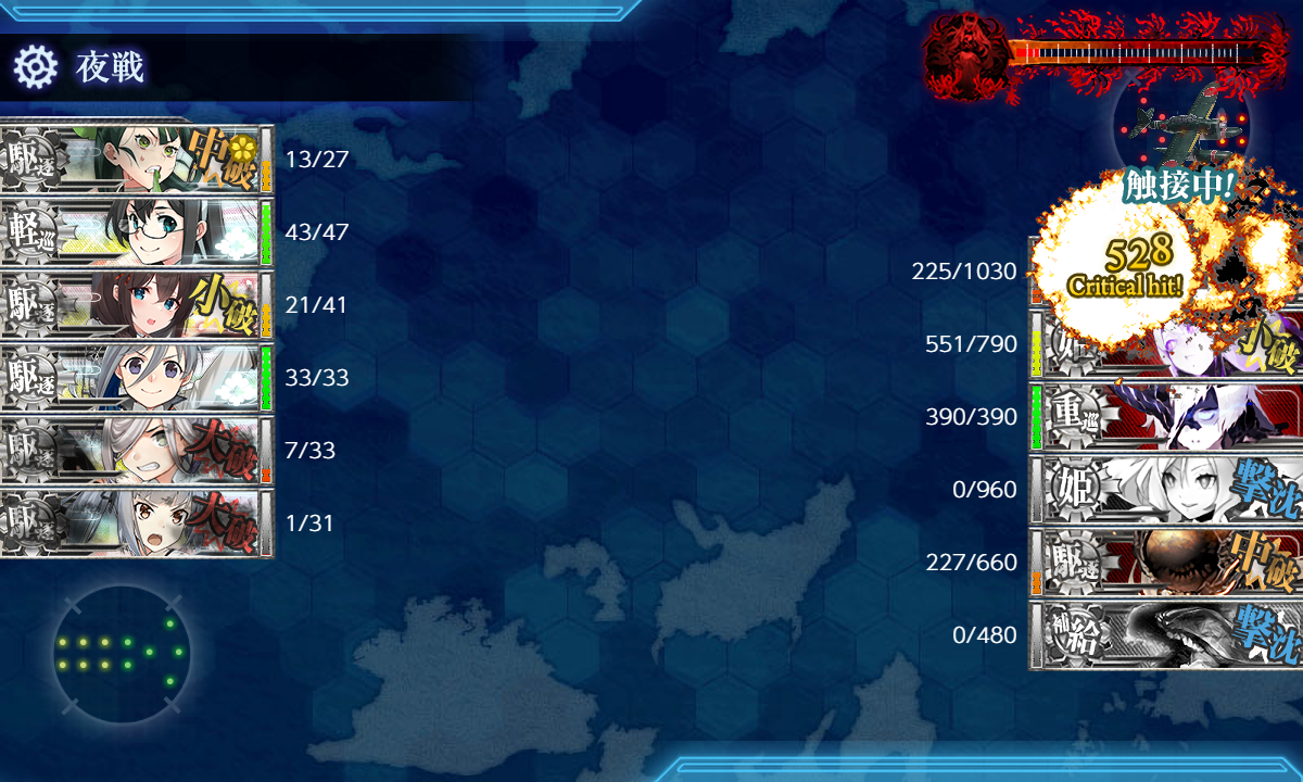 6-3削り始めから破砕完了まで割とすんなりだと思いますがそれでも燃料3万5千とバケツ120くらい減りました。これから臨む方は計画的に進めたいですね。さて、あとは割るだけですがその割るだけも・・・ここから本番な気もしますね。これまでの苦労を見てネと闇玉波が手加減してくれるといいな・・・。潜水姫もか。