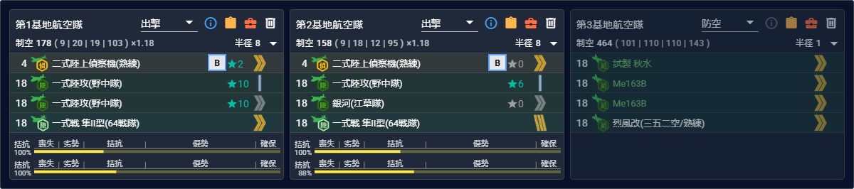 次は『[空襲]航空優勢↑×2+FマスS勝利×2』。基地航空隊2部隊でもいけるかなとここで[空襲]迎撃を狙います。