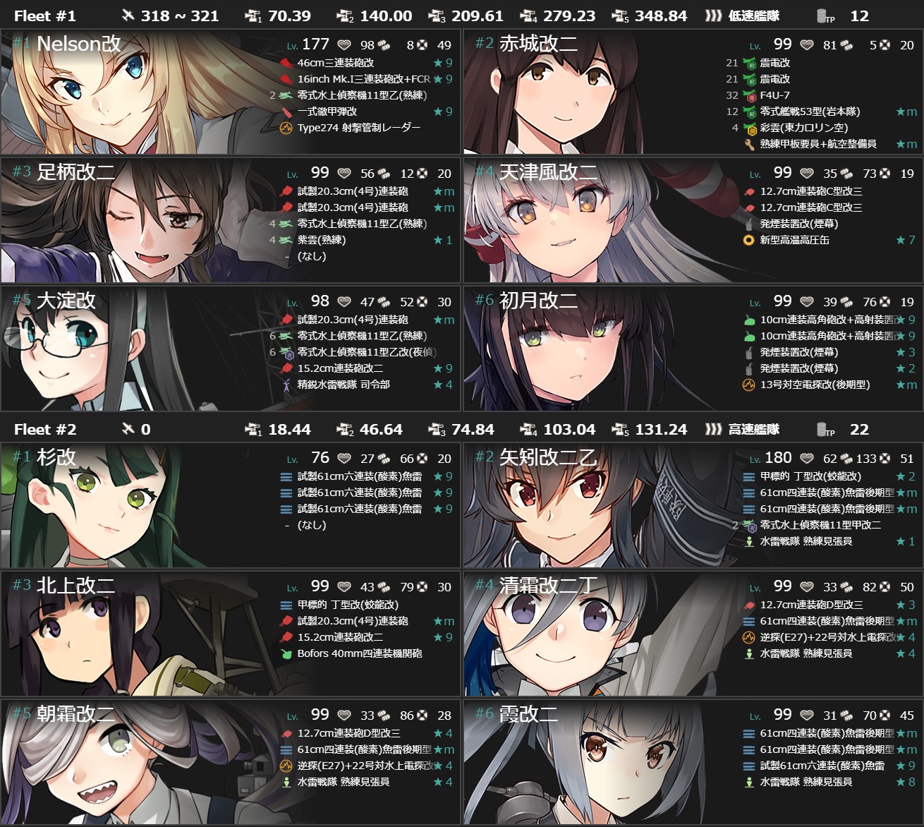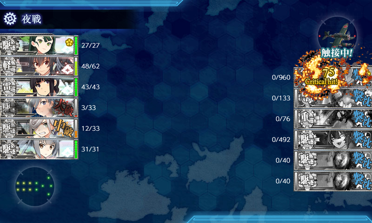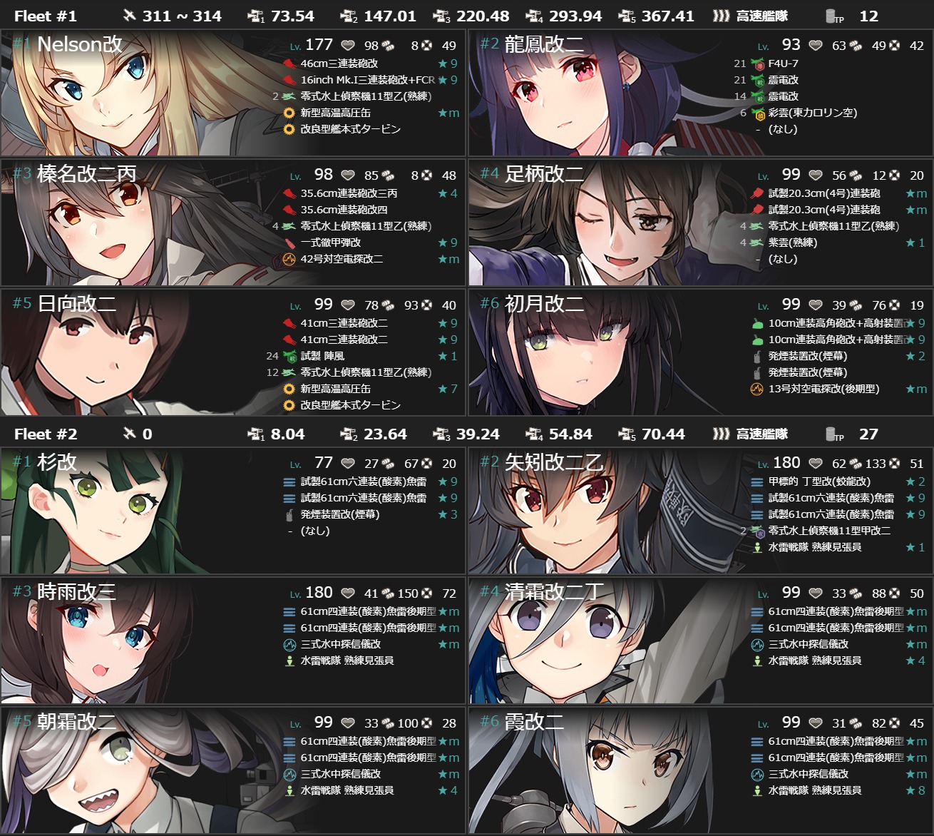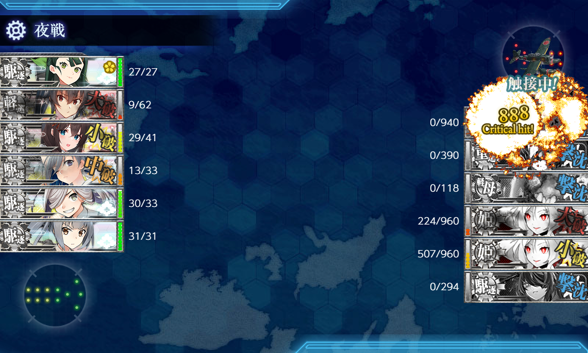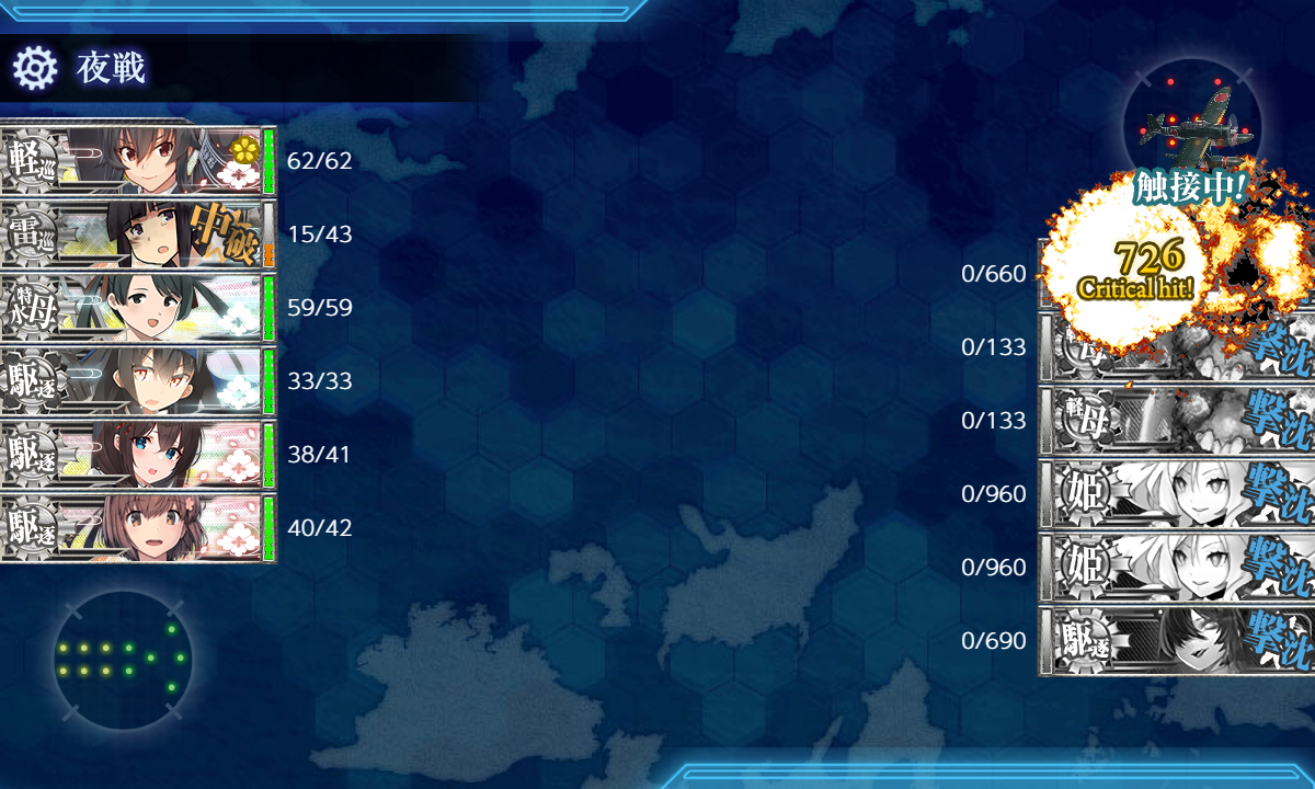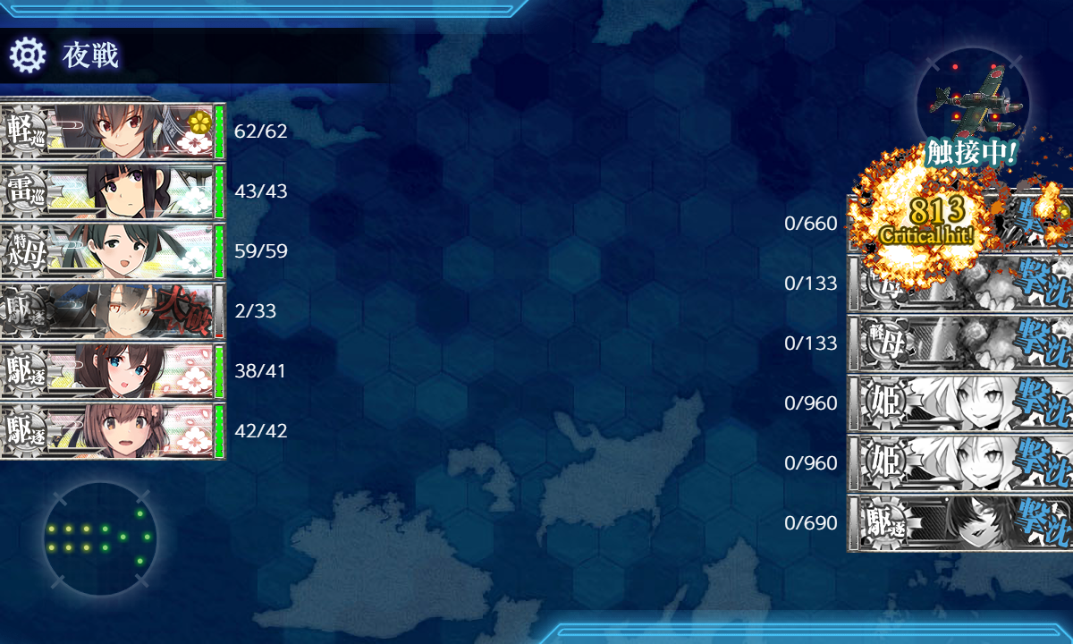 第一:榛名、伊勢・日向、(主砲2,偵察、戦闘機、高速化)足柄(主2、偵察、煙幕)、初月(煙幕と対空カットイン)、龍鳳(戦3、江草1。伊勢日向のおかげで江草積める。)、第二:杉、時雨・霞・清霜・朝霜(魚雷2、ソナー1、見張り)、大淀。基地はボス2、東海1。道中、決戦支援有り。