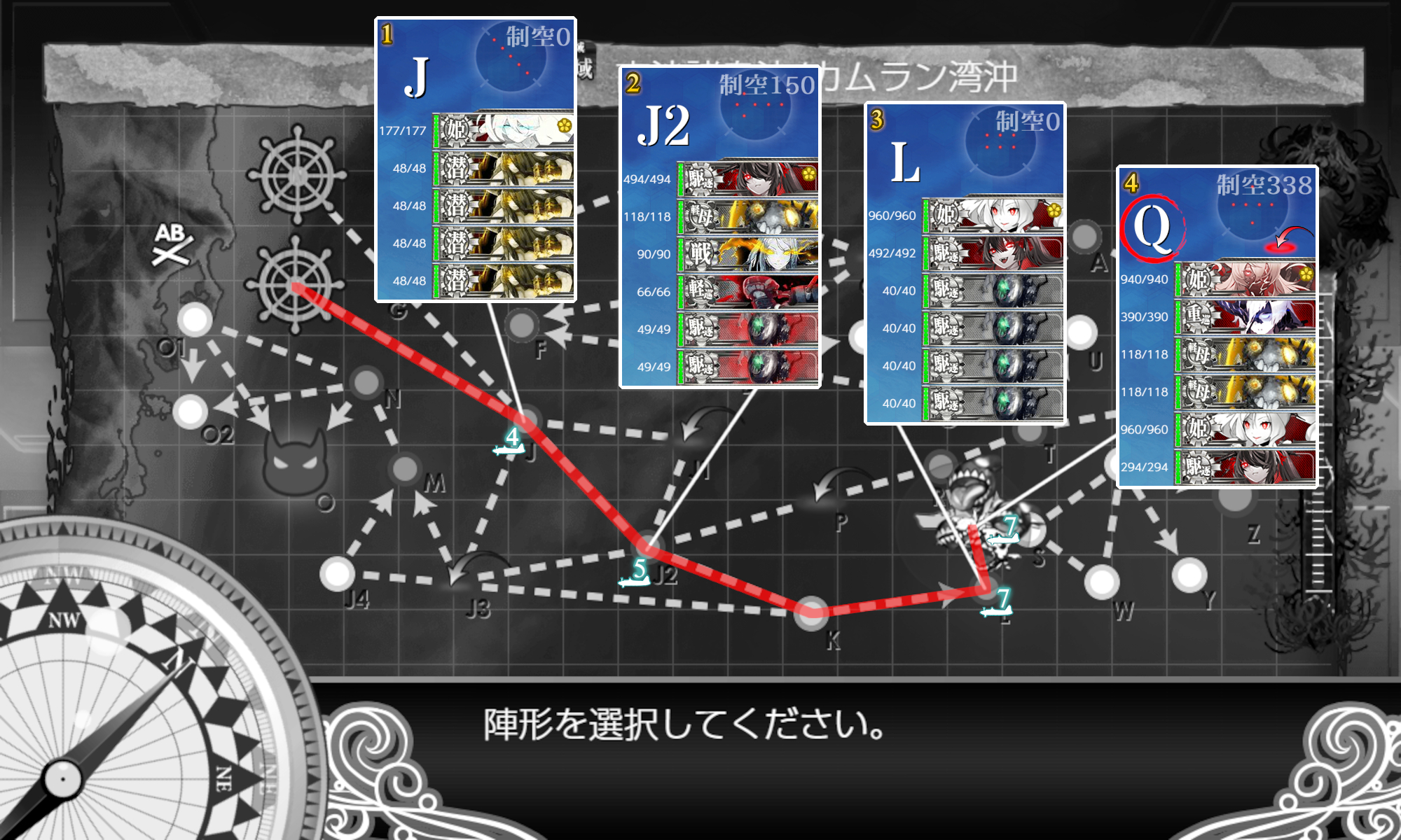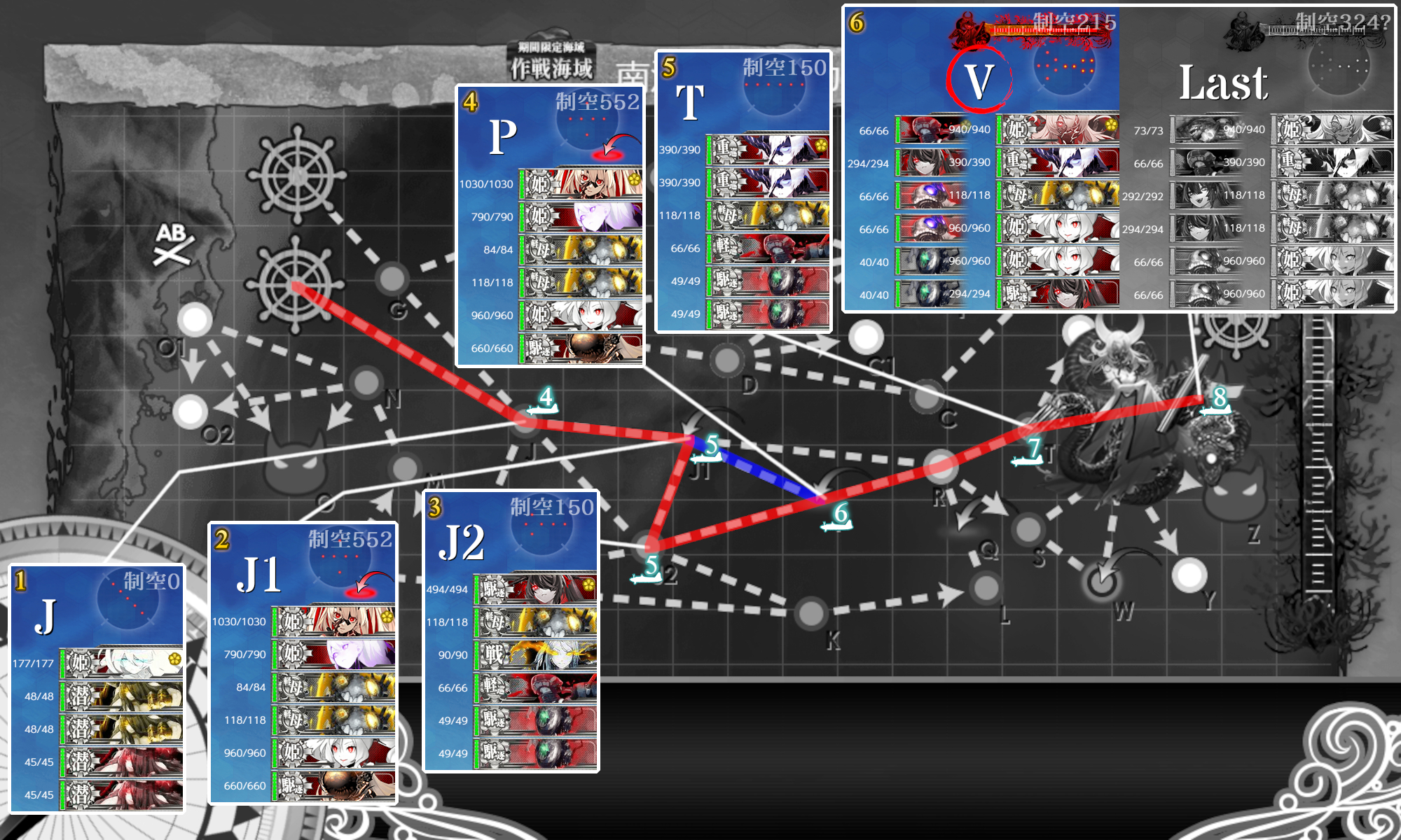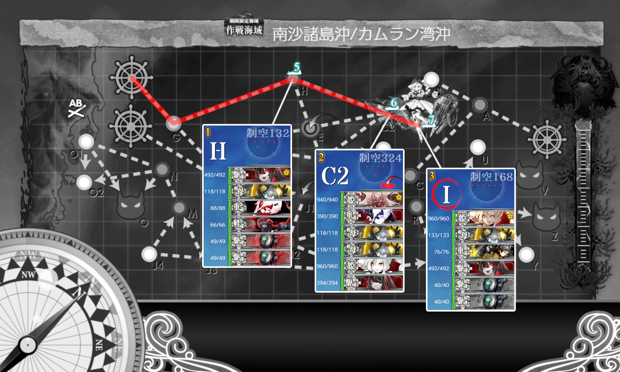 まだ[空襲]迎撃が未達成の場合は"潜水新棲姫"(J)マスは気合で抜けてどうにか。達成済みなら[東海]部隊を送ってok。