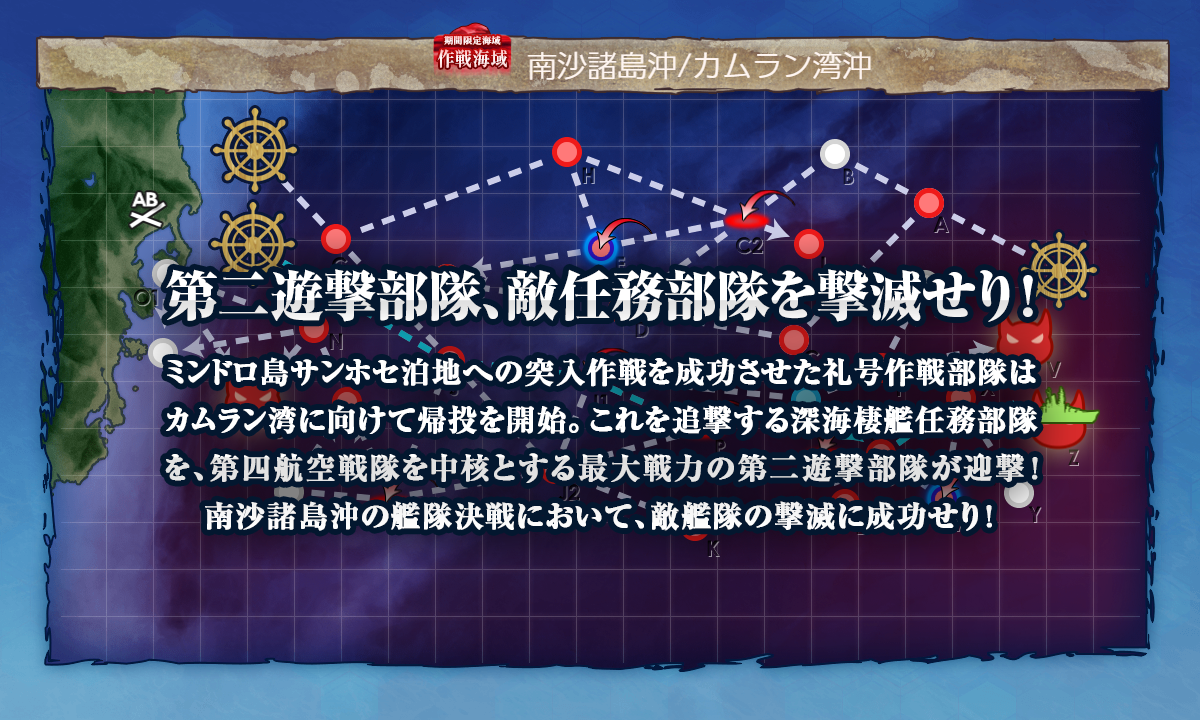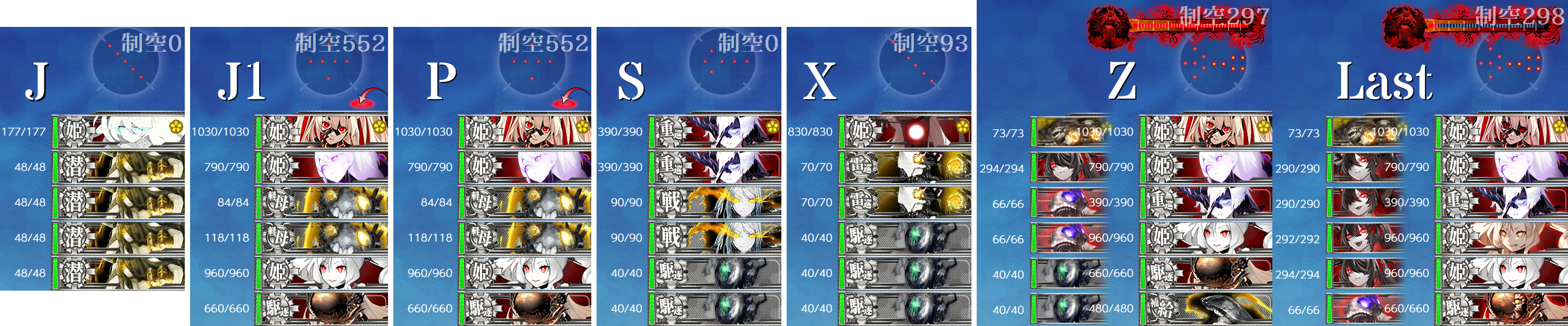 ただ道中の空襲戦(J1,P)が航空劣勢になるのでそこを嫌うなら「日向」に[艦戦]を載せて航空拮抗まで稼ぐのも手かも?