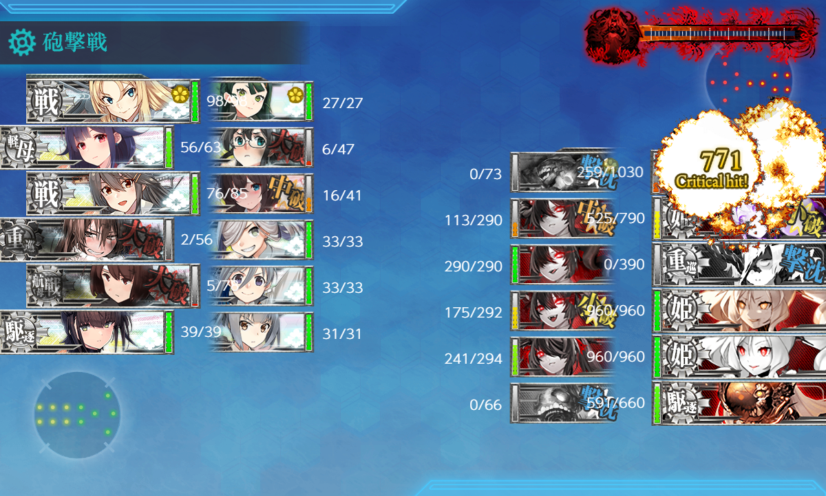 たまに外れで大破中破祭りもありますが、煙幕焚いて第二艦隊の面々がそれなりの数が小破以下で残るのがよかったですね。