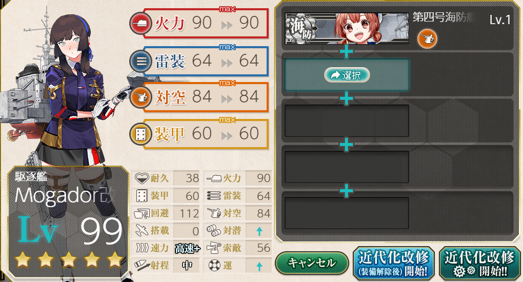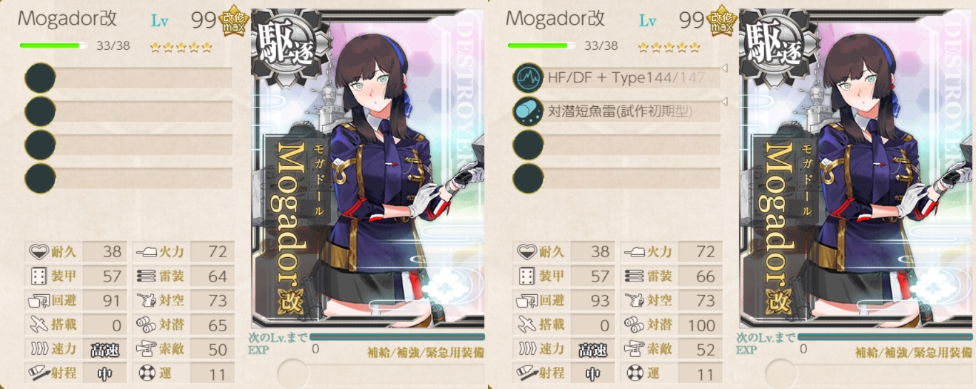 「Mogador」99Lv素の対潜は[63]なので[対潜+2]で完成。1スロ対潜ではなく2スロ対潜ですが4スロ艦なので意味があるはず。
