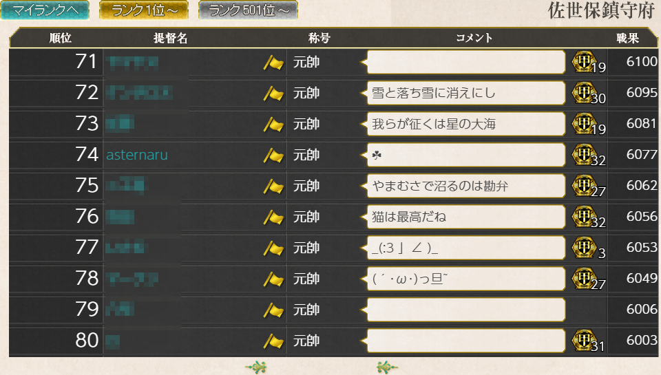 梅雨任務とかイヤーリー,クォータリー戦果拡張任務の兼ね合いで激戦になってその中でも第三群がとんでもないのでそれならいっそ上位を狙ったほうがお得かな?と頑張りましたがこのまま何とかなって欲しい_(:3 」∠ )_