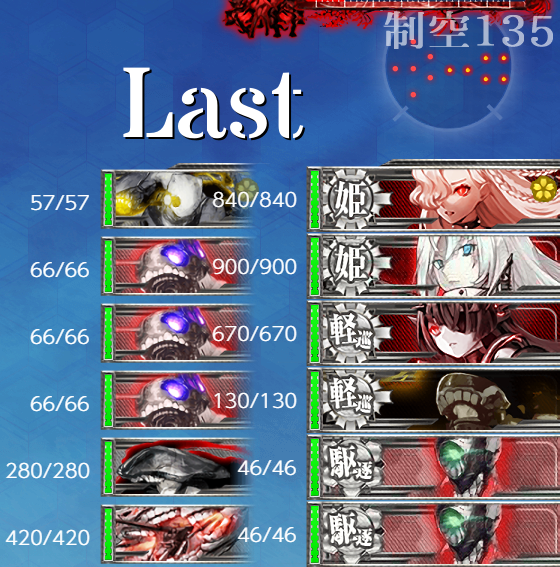 [第四陣形]姫級の2隻はなかなかですがあとは"ム級"と"深海陸上小鬼"がそこそこなぐらいで随伴艦が貧弱なので削りは問題ないはず。撃破難易度はそこそこだと思いますが「矢矧」の魚雷CIで500damageとか出たので主力艦or欧州艦がしっかり狙えば火力が通るので削り段階はすぐ終わるはず。むしろ"深海陸上小鬼"の方がS勝利的には厄介かも。