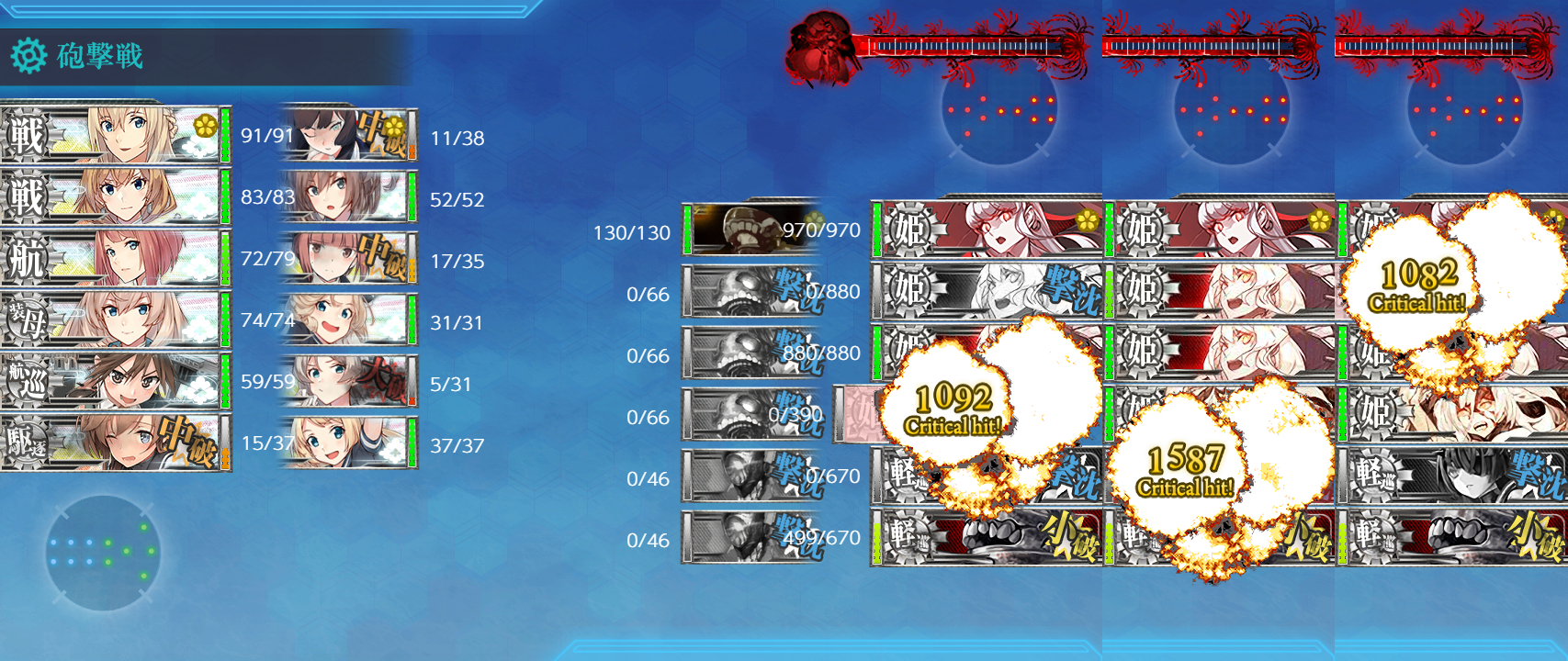 "欧州棲姫-壊"までは特殊砲撃で確殺ですし連撃の1発で800↑damageとか出るので「Warspite」「Valiant」が先に潰されなければ昼戦で終われるんじゃないでしょうか。流石に"巡洋戦艦水姫-壊"を特殊砲撃で1発は厳しそう?