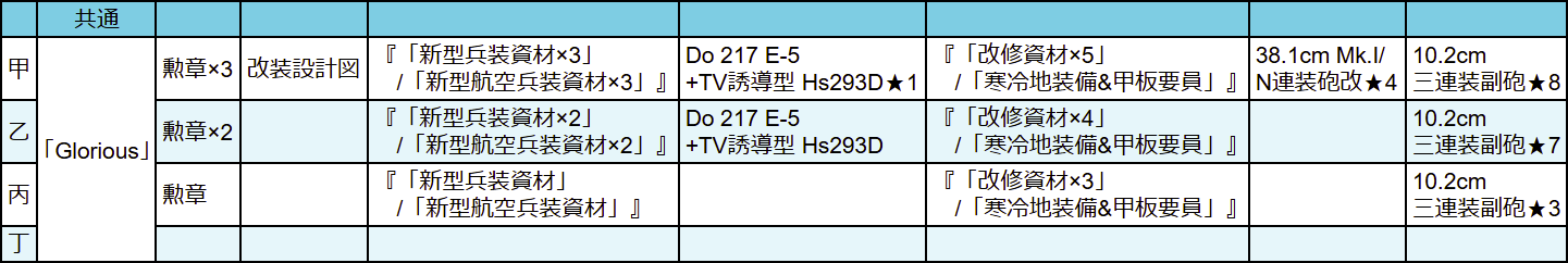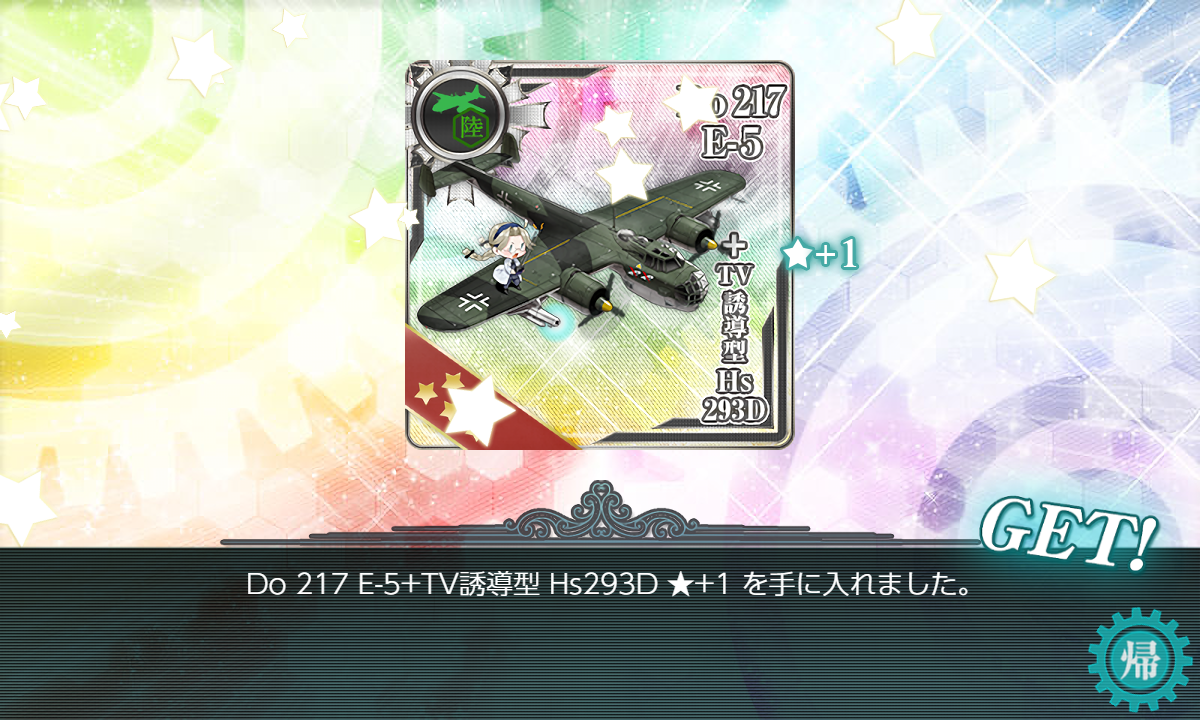 選択は「新型兵装資材×3」「寒冷地装備&甲板要員」に。「寒冷地装備&甲板要員」は正直もう要らないと思うんですがネジ×5との選択なら流石に?あとは[Do 217 E-5+TV誘導型 Hs293D]は取っておきたいので【乙】↑の攻略は頑張りたい。