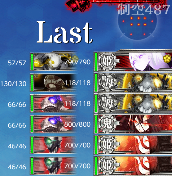 [第四陣形]削り段階から姫級3隻でどの姫級も簡単に落とせませんし"輸送ワ級II"がいることでこっちの"空母"は枯れやすいので難易度が一段階上がったかな?という印象。ただ昼戦で姫級以外を落として夜戦で3択という状況は作りやすいですしこちらの第二艦隊も比較的被弾しにくいので旗艦撃破が安定する程ではないですが削りはすんなりいくはず。