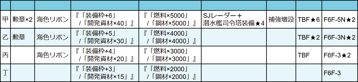 ここは[SJレーダー+潜水艦司令塔装備]をどう見るか。米"潜水"の補強増設に載せられるので悪くはないですが……[F6F-5N]も貴重なので【甲】攻略を目指す価値はあると思いますが[#E4-3]がなかなかなので妥協しても?