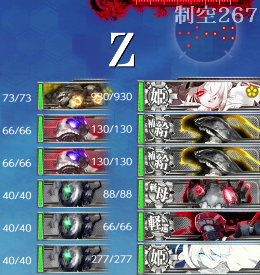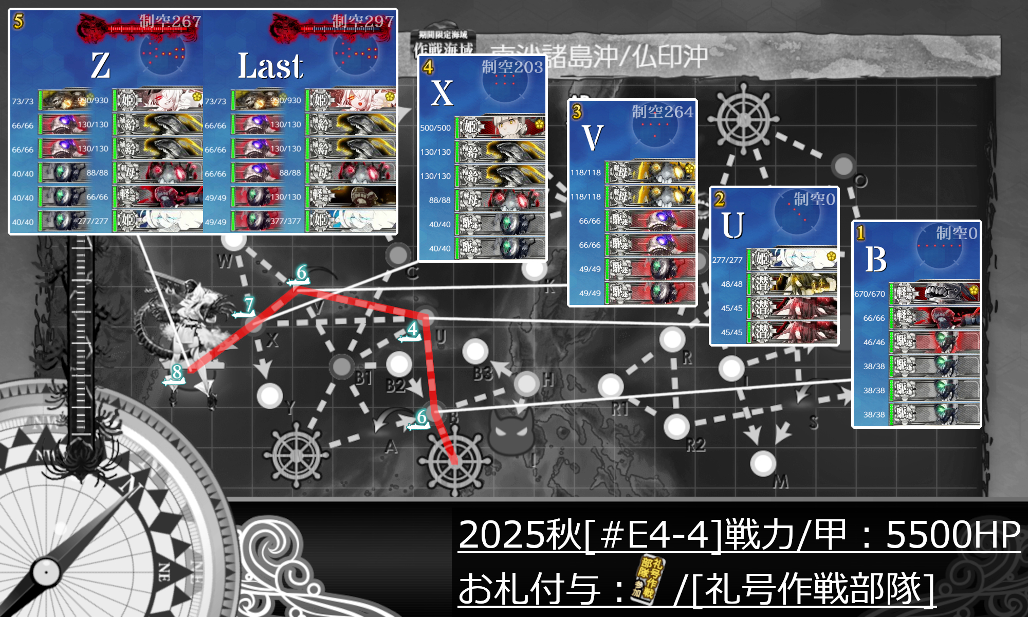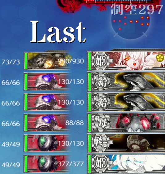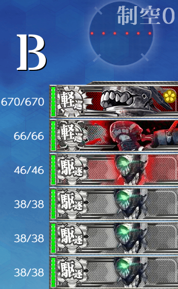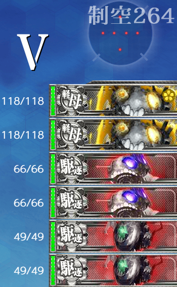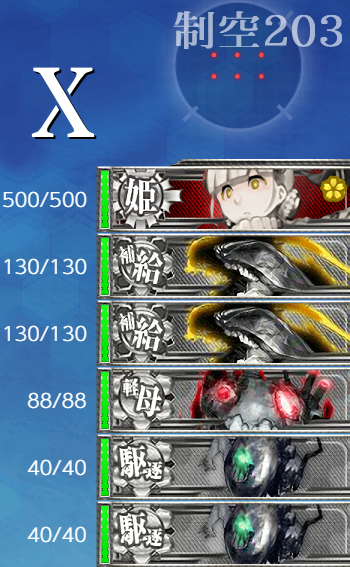 - 制空値 基地航空隊の削りがあるので"軽空"1人を[艦戦]×4にすればボス戦で航空優勢が取れるはず。