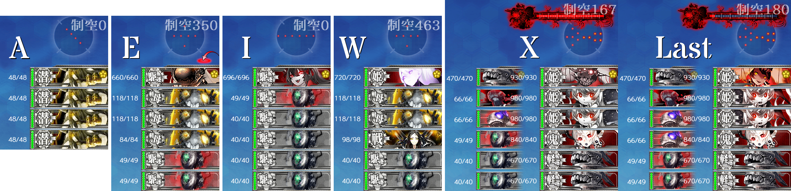 - 制空値 ボスは制空値が低いのでどうとでもなるとしてボス前(W)到達時に制空値309↑あれば航空拮抗になるのでそこを目安に。