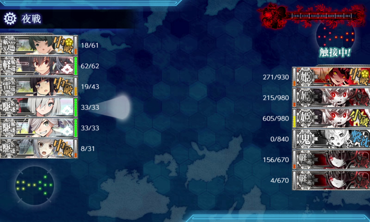 あとは夜戦で魚雷CIが刺さるかどうかですが恐らくここ用に温存していた主力艦を投入するはずなので旗艦を撃破出来るかどうかは置いといて削りはすんなりいくと思います。先に潰されたりすると削れないこともありますが……。