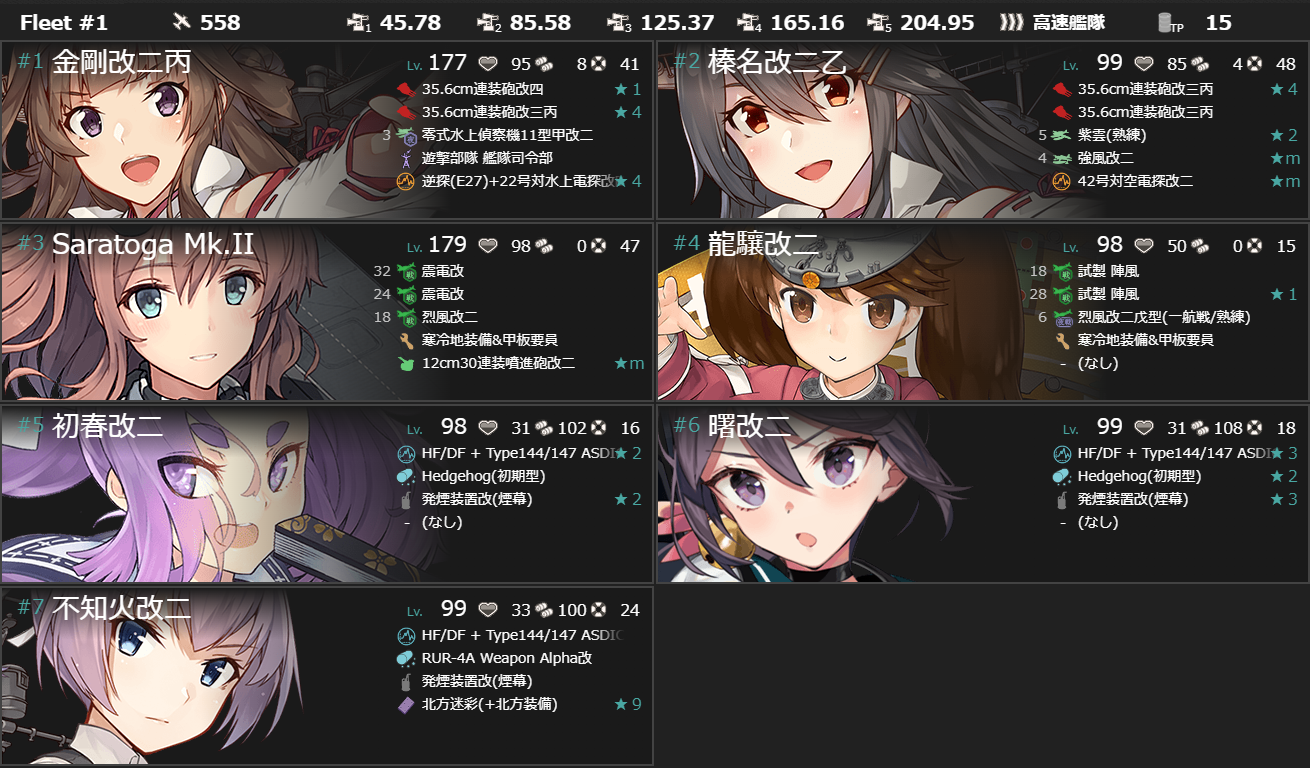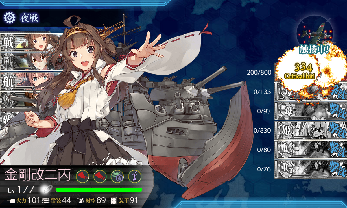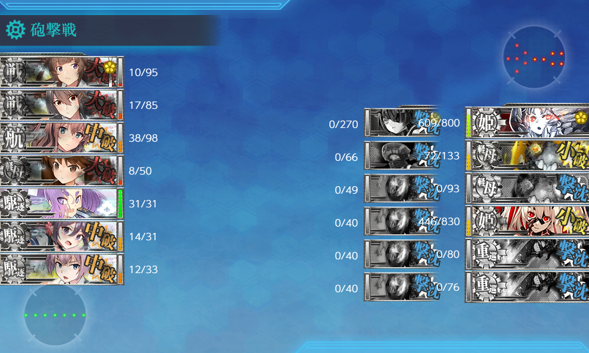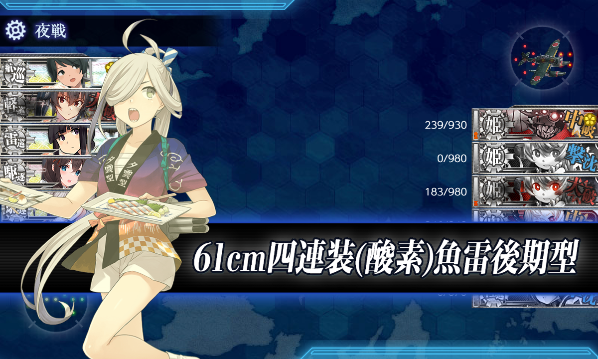結局撃破には特殊砲撃が発動して的を減らして魚雷CIを旗艦に刺すという良い流れが必要なのでその良い流れが引けたなら装甲破砕なしでもいけて、装甲破砕してもその流れが引けなかったら……という印象。装甲破砕は妖怪対策という感じかな?