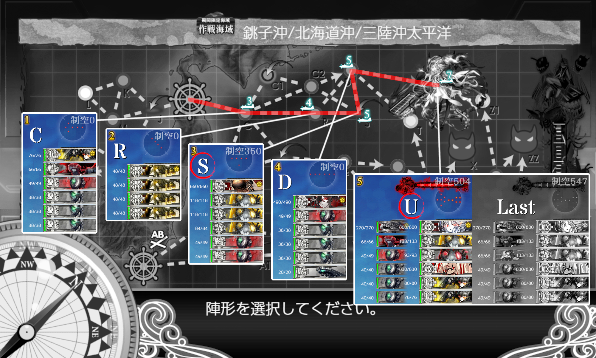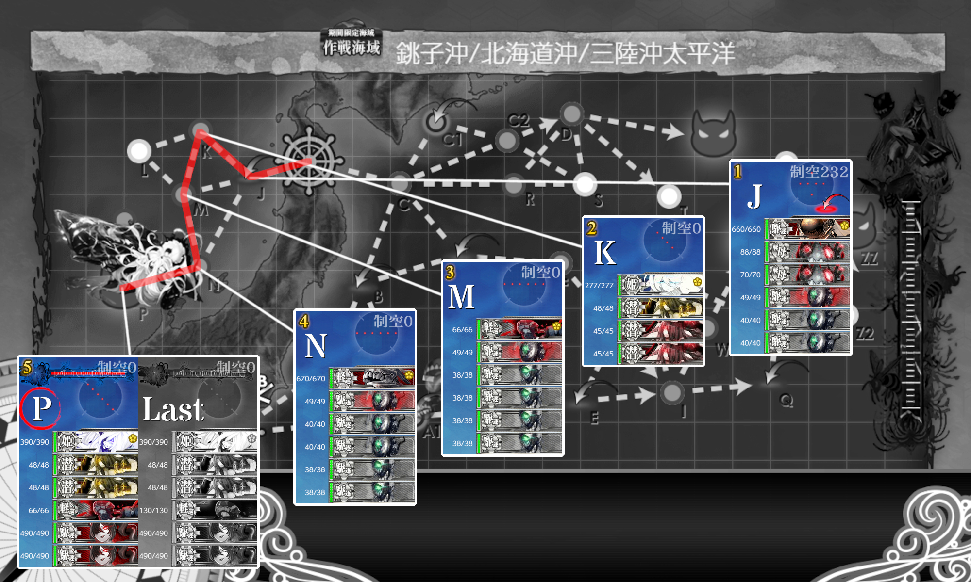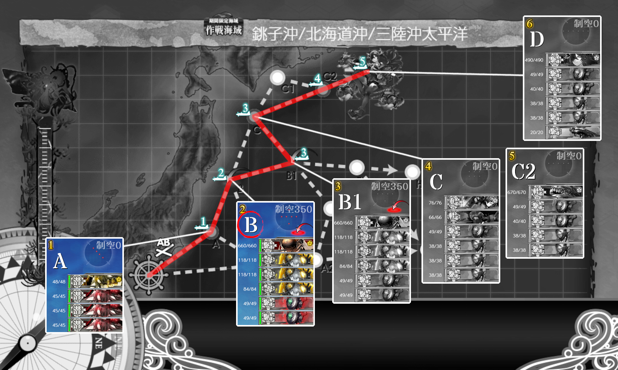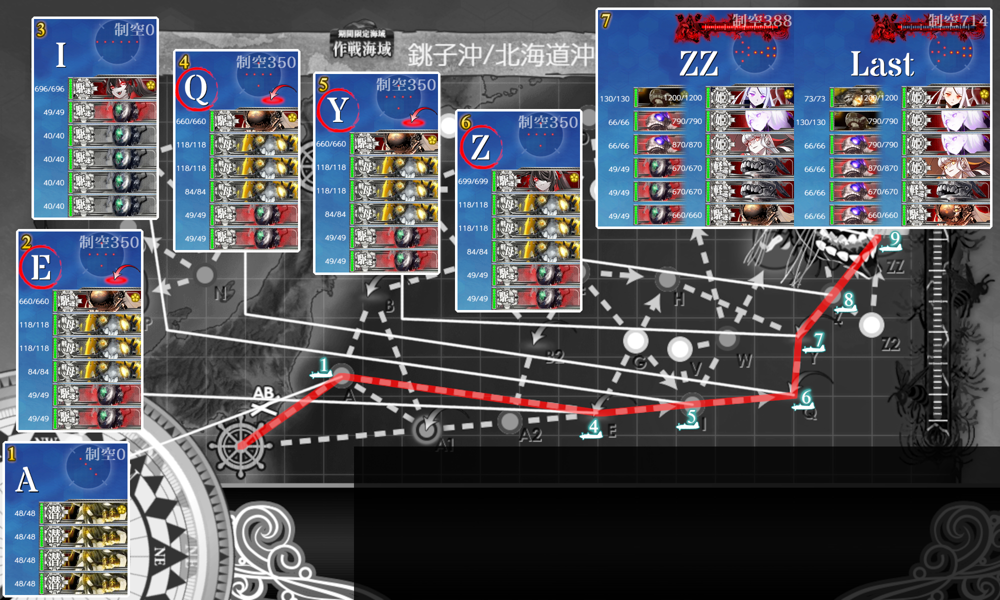 次は『PマスA勝利×2+[空襲]航空優勢↑』。[#E5-1]とほぼ同じですが[空襲]迎撃もしたいので低速やや遠回り√。