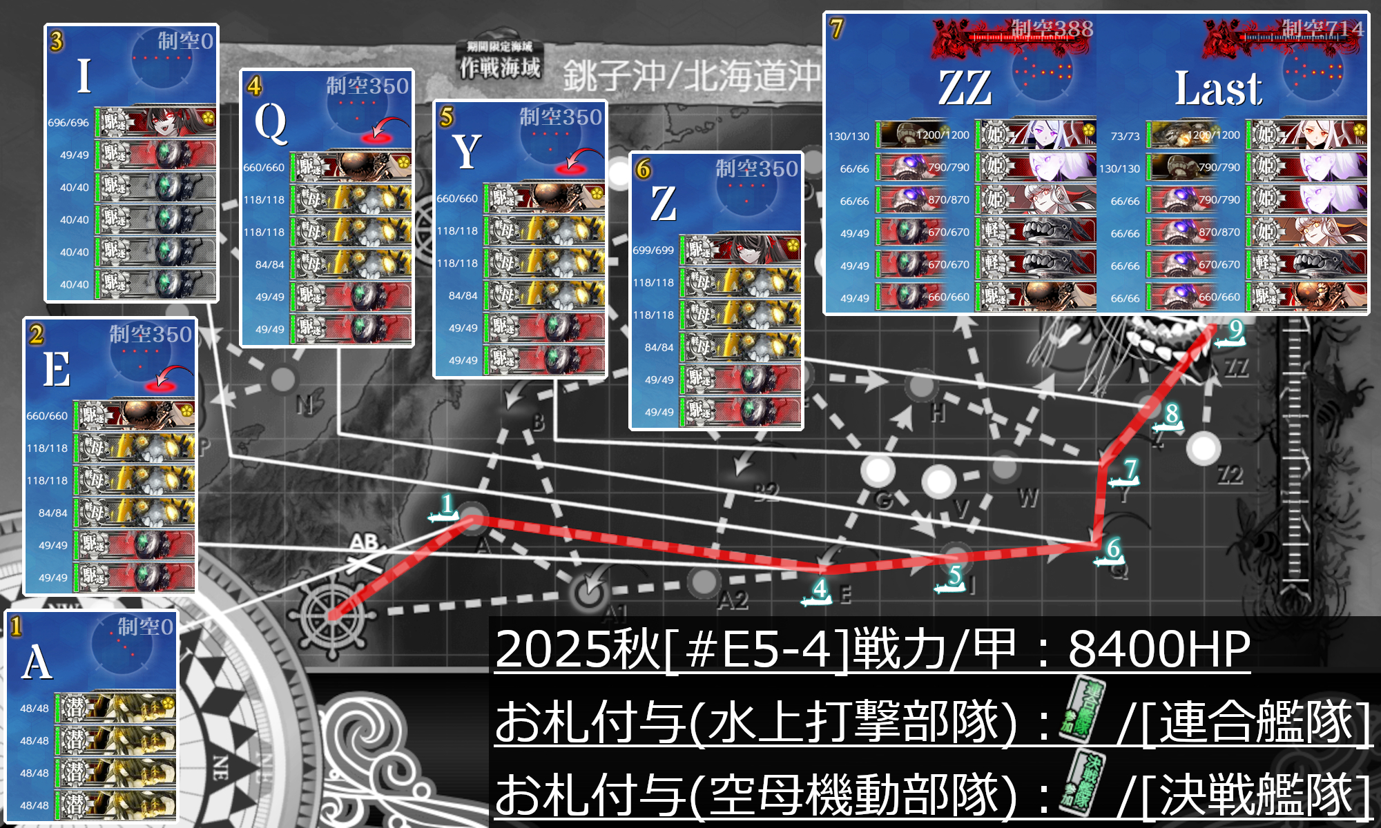 道中で"ラ級"との戦闘が2回あるので相応に大破撤退はありましたけど[決戦艦隊]札√だと道中がもっときついですし恐らくこっちの方が楽。肝心のボス戦(ZZ)も「大和」が先に潰されたりで特殊砲撃が不発だと削れないこともありますが逆に発動すればあとは第二艦隊次第で旗艦撃破も狙えるので[連合艦隊]札に多めに戦力を割くのが正解かと思います。