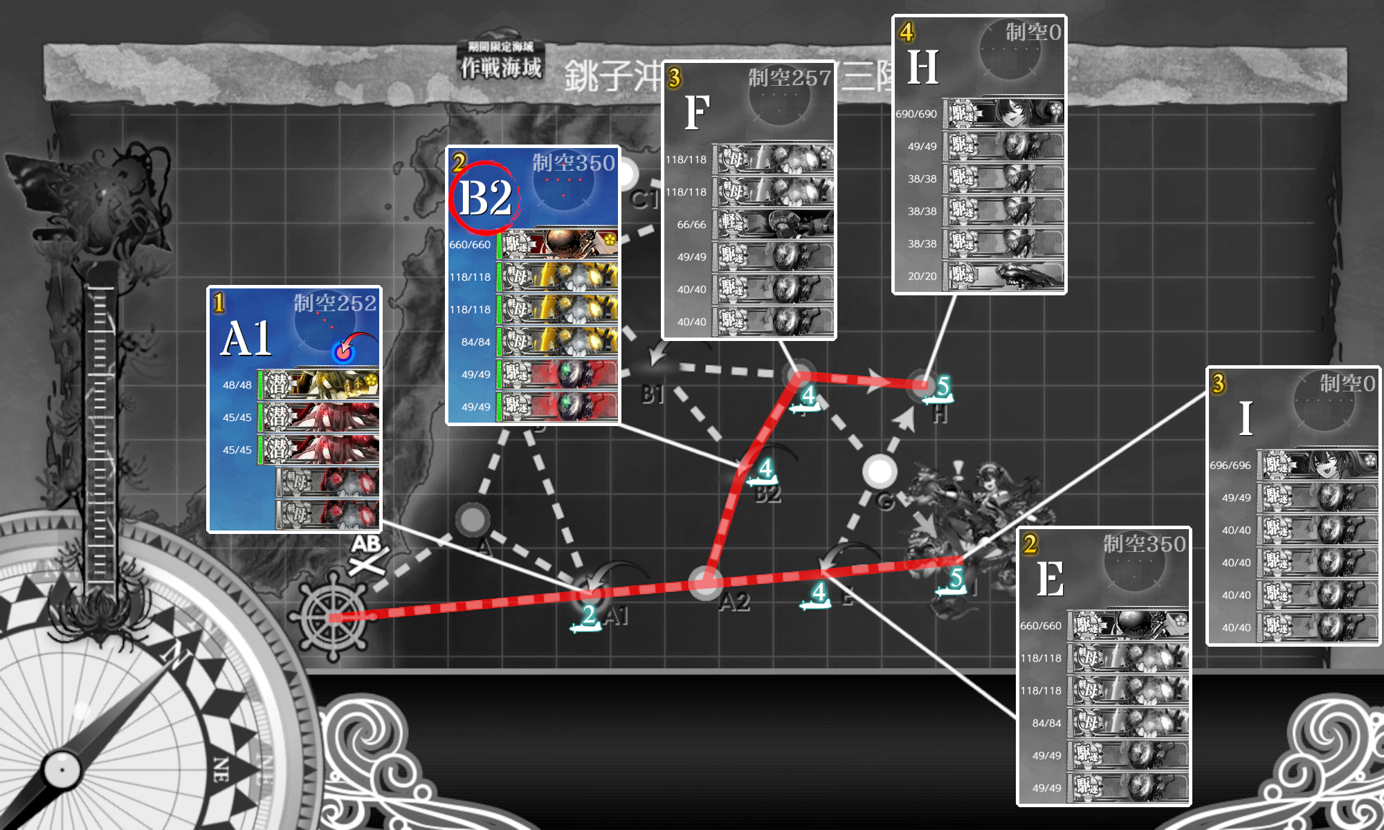 赤文字は海域拡張に必要な条件なので[決戦艦隊]札で削り,攻略をしたい場合は[#E5-4]開始時に着手すればok。