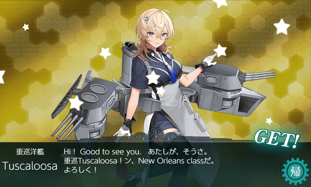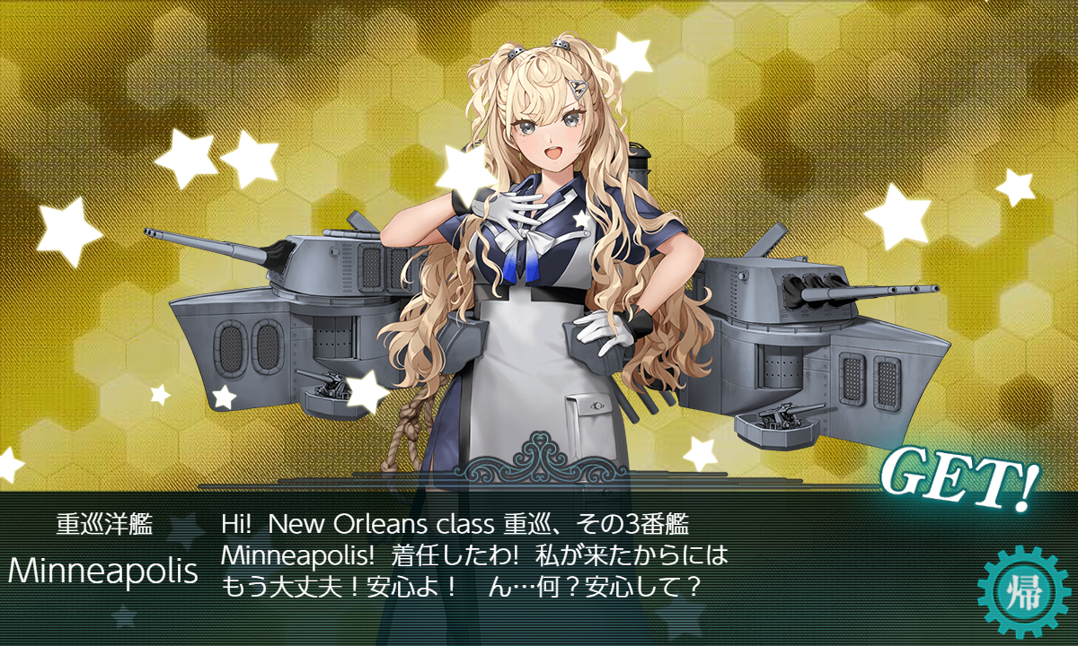 「Tuscaloosa」「Minneapolis」とか「樫」よりドロップ率が低いはずなんですがねぇ……「Tuscaloosa」に至っては0.1%程っぽいのでそこが引けているのに……まぁ"海防艦"がそこそこ拾えましたし周回自体は楽だったのでこんなものかな?